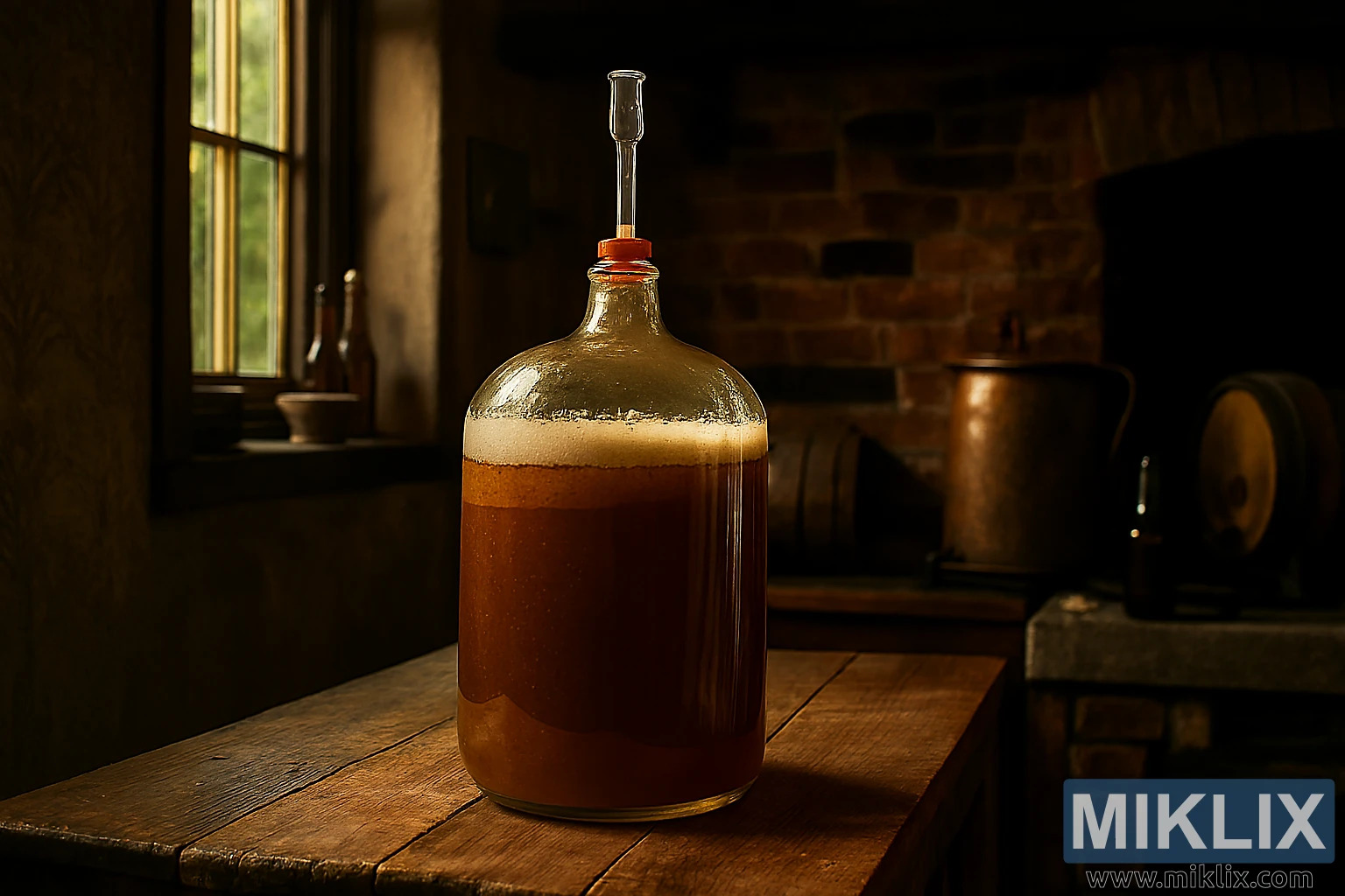 تصویری با جزئیات کامل از آبجوی سنتی بریتانیایی که در یک کاربوی شیشهای در حال تخمیر است، در یک محیط گرم و روستاییِ آبجوسازی خانگی با دکوراسیون قدیمی و نورپردازی طبیعی.