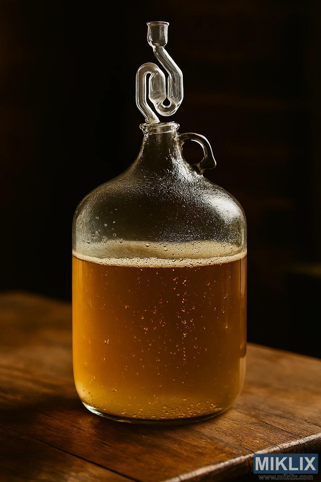 در یک محیط دمآوری روستایی و گرم، یک کاربوی شیشهای با افتخار روی یک میز چوبی فرسوده قرار دارد که پر از مایعی شفاف و طلایی است که به آرامی با مخمر آبجوی بریتانیایی که دم کرده را آماده میکند، حباب میزند. کاربوی از شیشه ضخیم و شفاف با بدنه استوانهای ساخته شده است که به سمت گردنی باریک باریک میشود. در بالا، یک قفل هوای S شکل که به درستی نصب شده و از پلاستیک شفاف ساخته شده است، به طور ایمن در یک درپوش لاستیکی قرار گرفته است که با مقدار کمی آب پر شده است تا گاز بتواند خارج شود و در عین حال از ورود آلایندهها جلوگیری کند. این جزئیات نشان دهنده توجه آبجوساز به دقت و بهداشت است - نشانههای یک فرآیند تخمیر خوب اجرا شده.
