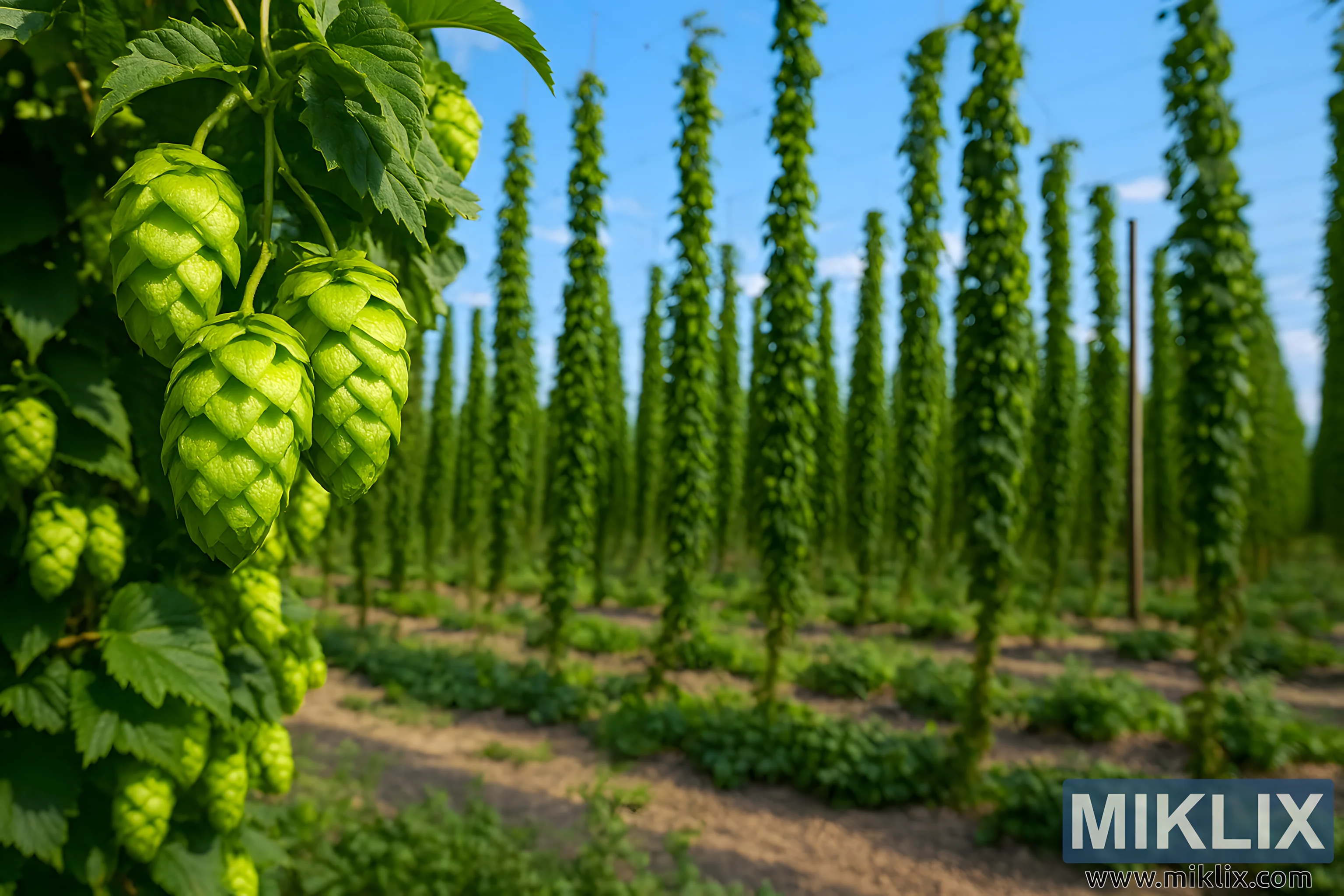 فراتر از پیشزمینه، تصویر به منظرهای وسیع از مزرعه رازک باز میشود، جایی که ردیفهایی از گیاهان رازک آبشاری تا دوردست امتداد یافتهاند. هر ردیف توسط یک سیستم داربستی بلند متشکل از تیرکهای چوبی با فاصله مساوی و شبکهای از سیمهای افقی و عمودی پشتیبانی میشود. بوتهها با قدرت بالا میروند و ستونهای سبز متراکمی را تشکیل میدهند که به سمت آسمان میرسند و مملو از مخروطها و شاخ و برگ رازک هستند. خاک بین ردیفها خشک و قهوهای روشن است و تکههایی از گیاهان پوششی کم رشد یا علفهای هرز به سطح زمین بافت میدهند.