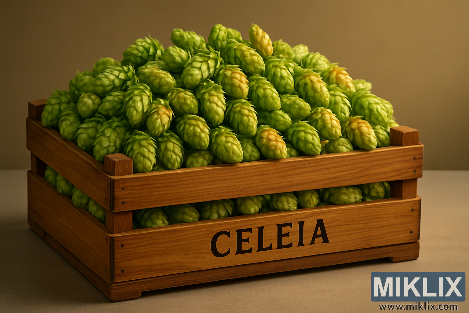 عکس استودیویی با کیفیت بالا از یک جعبه چوبی پر از رازکهای تازه برداشت شده سلیا، که مخروطهای سبز پر جنب و جوش، نورپردازی گرم و مهارت هنری درجه یک را به نمایش میگذارد.