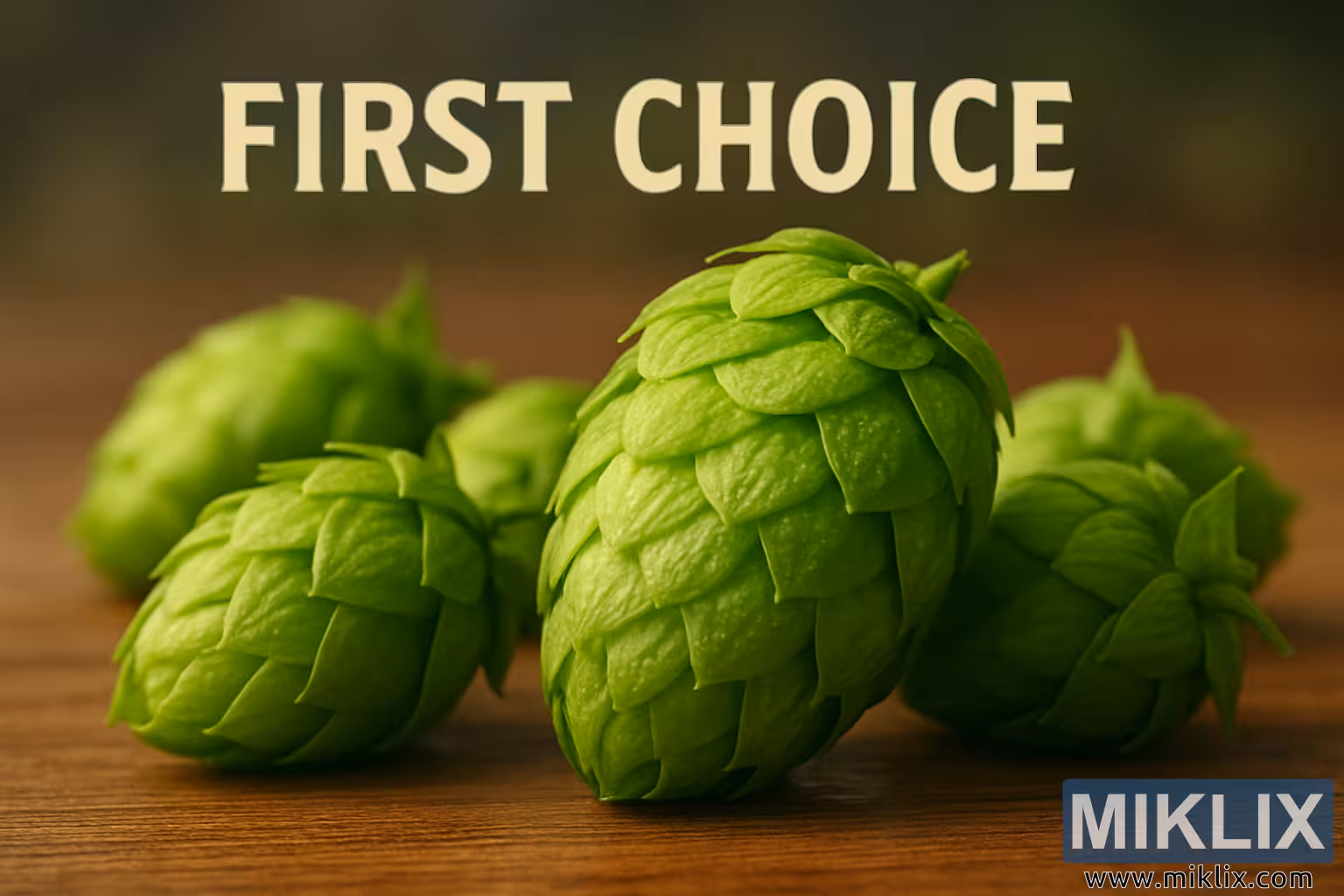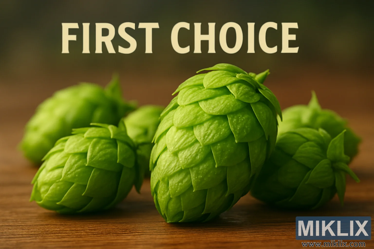 این تصویر، نمای نزدیک و چشمگیری از مخروطهای رازک تازه برداشتشدهی First Choice را نشان میدهد که با دقت و توجه به جزئیات ثبت شده است. ترکیببندی افقی و نورپردازی مناسب، به گونهای طراحی شده است که بر زیبایی طبیعی، ساختار و تازگی رازکها تأکید کند. مخروطها به طور مرتب روی یک سطح چوبی صاف چیده شدهاند، محیطی که ویژگیهای ارگانیک و خاکی سوژه را افزایش میدهد و در عین حال، مهارت و دقت در کار با آنها را نیز نشان میدهد.