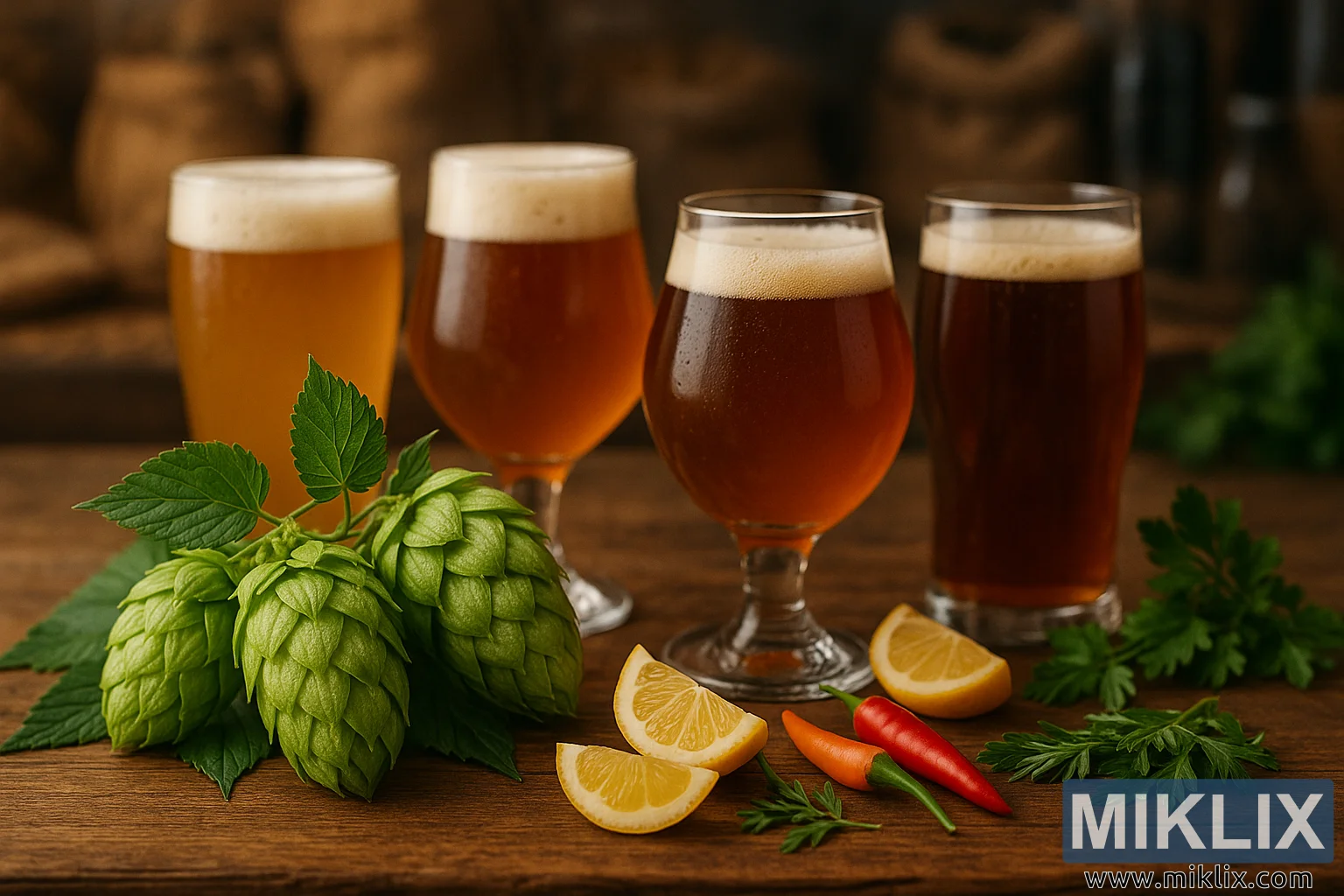 صحنهای روستایی با چهار لیوان آبجوی کهربایی روی میز چوبی به همراه رازکهای تازه برداشت شده First Choice، برشهای مرکبات، فلفل چیلی و گیاهان معطر. پسزمینه محو کیسههای مالت و تجهیزات دمآوری، فرآیند دمآوری دستی و ترکیب طعمها را برجسته میکند.