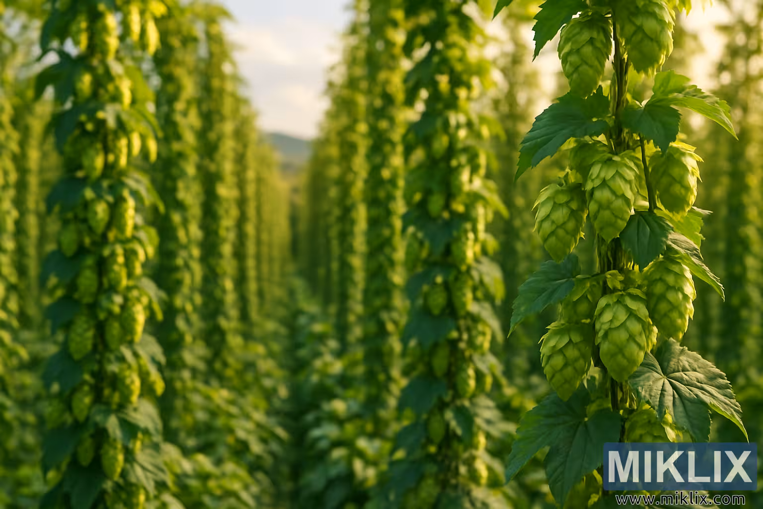 مزرعهای زیبا از رازک در حومه شهر امتداد یافته است، با مخروطهای رازک سبز و پرجنبوجوش که در زیر نور طلایی خورشید به وضوح دیده میشوند و فراوانی، طراوت و زیبایی روستایی را تداعی میکنند.