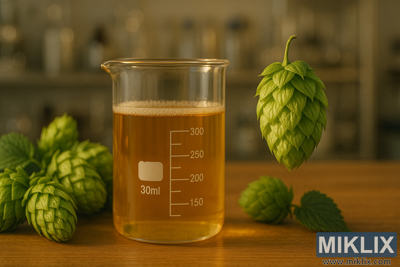 این تصویر، صحنهای الهامگرفته از آزمایشگاه را با دقت چیدمان کرده است که تلاقی علم و سنت دمآوری را به تصویر میکشد. در مرکز این ترکیب، یک لیوان شیشهای شفاف قرار دارد که با درجهبندیهای اندازهگیری دقیق تا ۳۰۰ میلیلیتر علامتگذاری شده است. این ظرف پر از مایعی غنی و طلاییرنگ است که در زیر نور محیط به گرمی میدرخشد و به تزریق عصاره رازک یا شاید یک دمآوری آزمایشی اشاره دارد. شفافیت مایع و خط کف ظریف نزدیک به بالای آن، تازگی و ظرافت را منتقل میکند و دقت فرآیندهای دمآوری کنترلشده را مجسم میکند. سطح بازتابنده آن، نور را منعکس میکند و درخشش ظریفی به آن میبخشد که بر خلوص محتویات تأکید دارد.