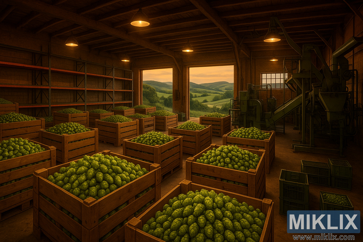یک انبار گرم و کهربایی رنگ رازک در تپههای وویوودینا، صربستان، که شامل جعبههای رازک تازه، قفسههای فولادی و ماشینآلات فرآوری است.