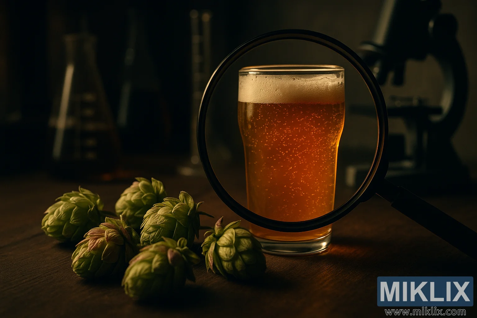 نمای نزدیکی از یک آبجوی طلایی هاپی زیر ذرهبین، احاطه شده توسط مخروطهای تازه هاپ در یک محیط آزمایشگاهی گرم و کمنور برای دم کردن.