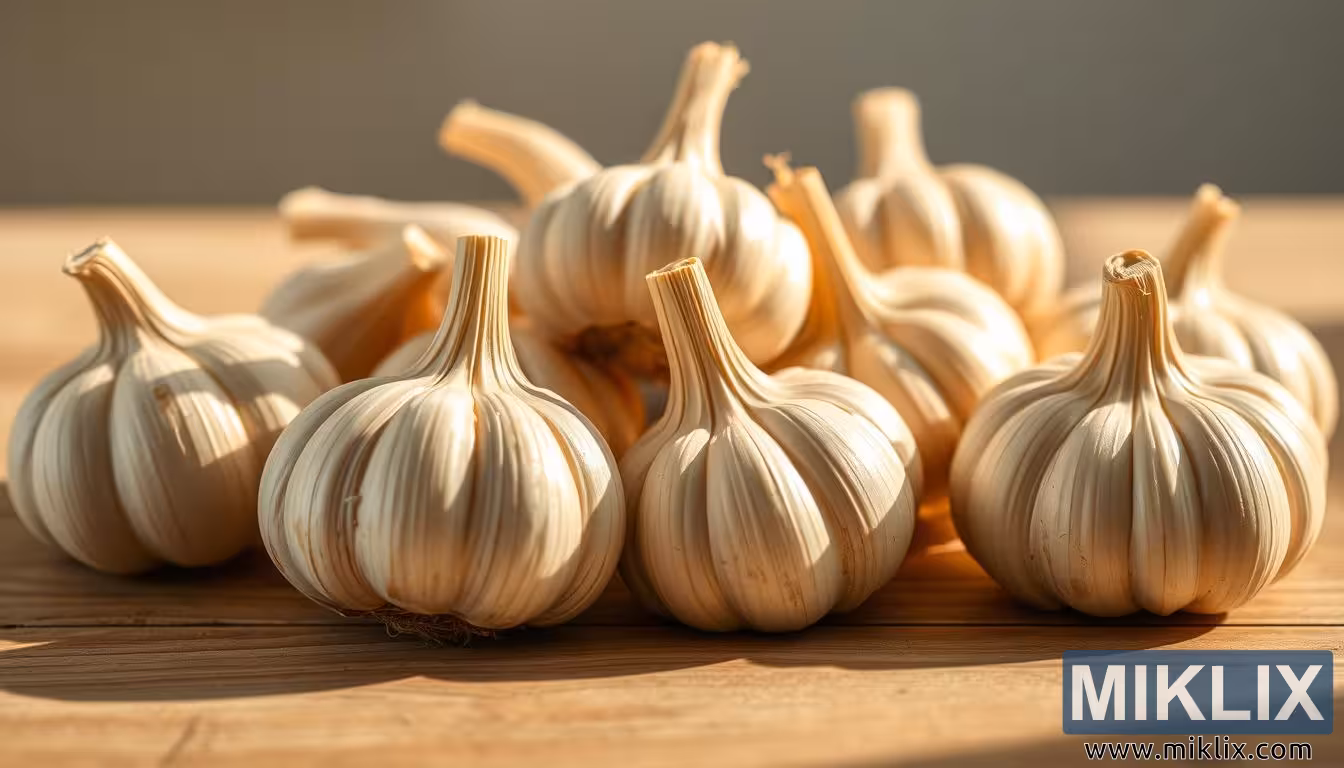 نمای نزدیکی از حبههای سیر پر جنب و جوش روی یک میز چوبی، که ساختار، تازگی و فواید آنها برای ایمنی و تندرستی را برجسته میکند.
