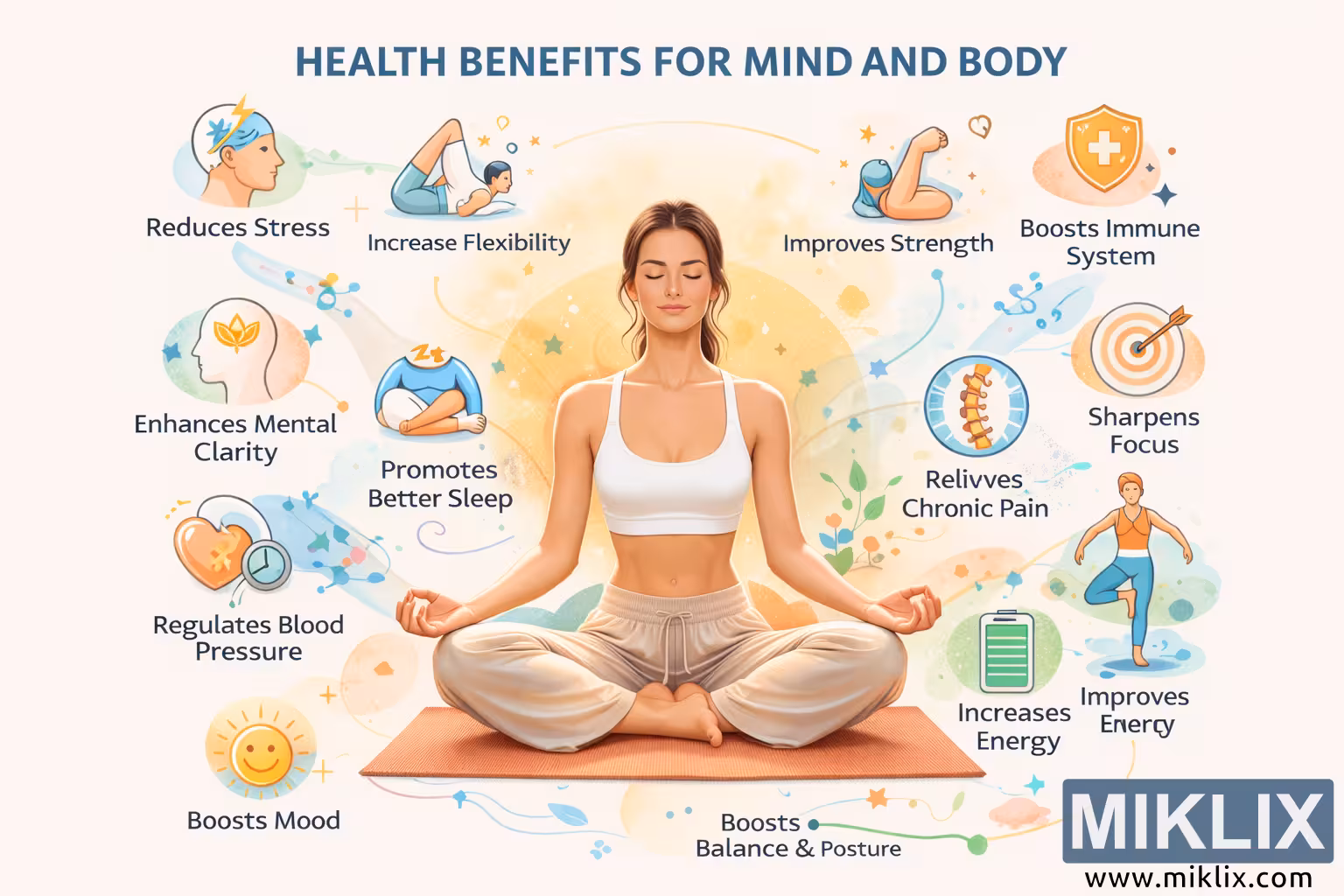 در قسمتهای بالا و راست، آیکونهای اضافی بر افزایش انعطافپذیری از طریق یک حرکت کششی، بهبود قدرت با بازوهای خم شده، پشتیبانی از سیستم ایمنی که با یک سپر و صلیب پزشکی نمادین شده است، تمرکز بیشتر با یک آیکون هدف، تسکین درد مزمن که با یک ستون فقرات برجسته نشان داده شده است و افزایش انرژی از طریق یک باتری درخشان و یک حرکت یوگای ایستاده پرانرژی، تأکید دارند. در مرکز پایین، یک بنر بر بهبود تعادل و وضعیت بدن تأکید میکند و مزایای جسمی و روانی را در یک موضوع منسجم به هم پیوند میدهد.