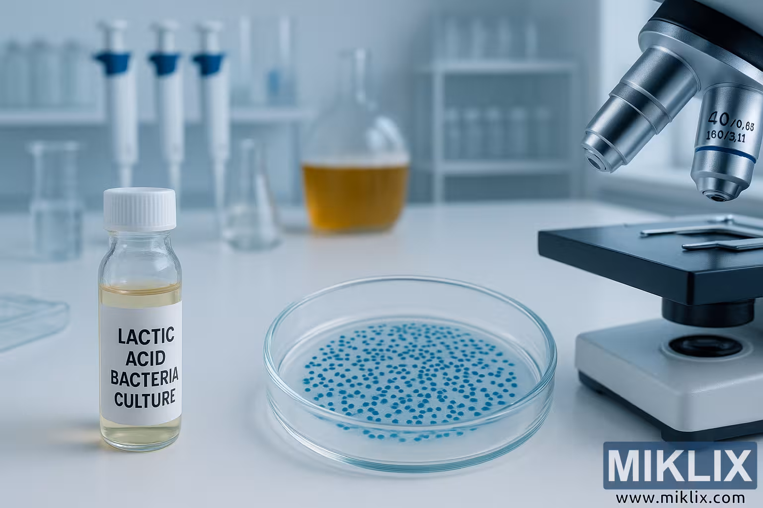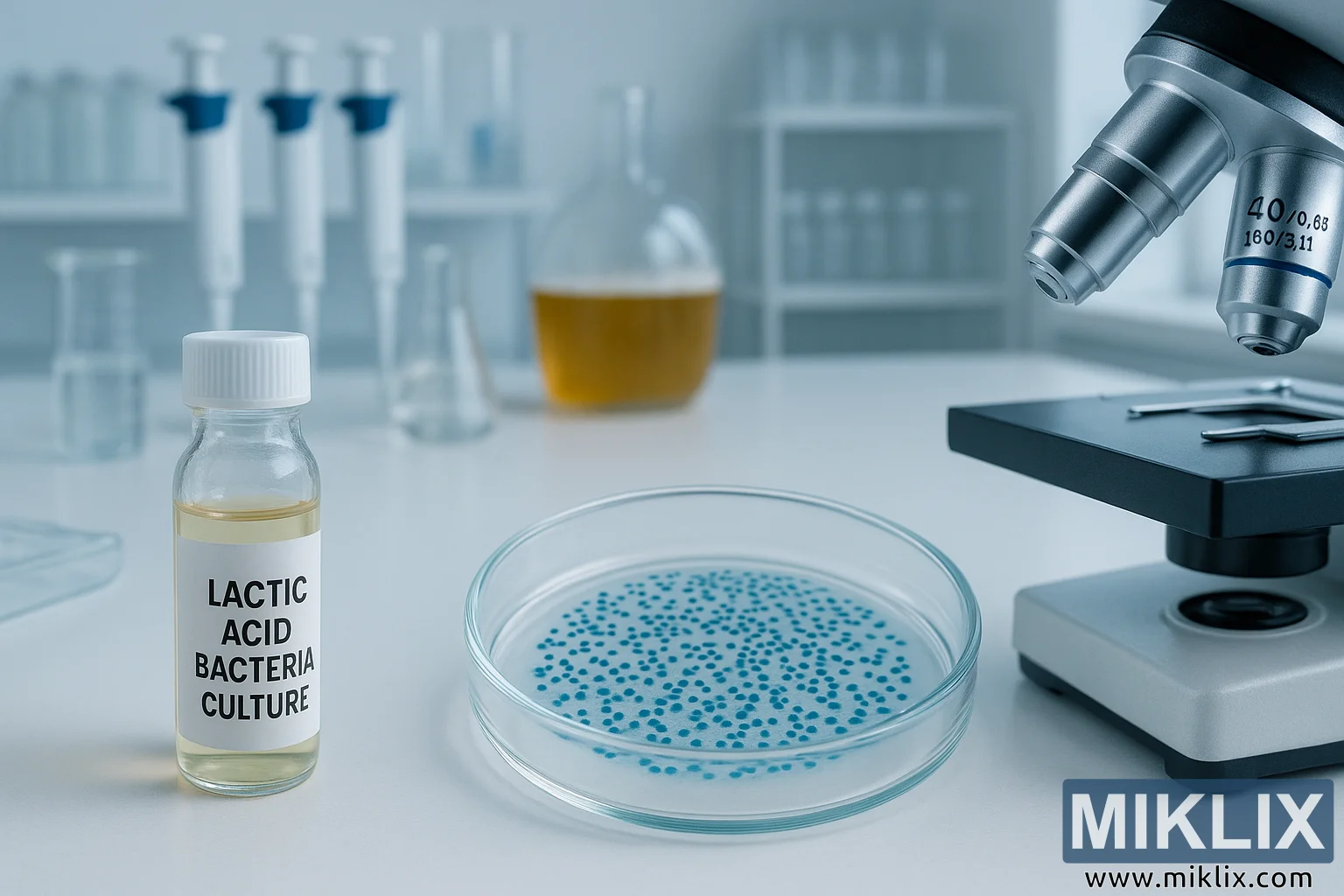 Katsojan huomion keskipisteessä, välittömässä etualalla, on kaksi keskeistä esinettä: pieni, kirkas lasipullo ja matala petrimalja. Pullo on sylinterimäinen ja suljettu valkoisella kierrekorkilla, ja se on täytetty noin puoliväliin vaaleankeltaisella, hieman läpikuultavalla nesteellä. Pullon terävässä valkoisessa etiketissä on paksu musta teksti "LACTIC ACID BACTERIA CULTURE", joka osoittaa selvästi sen sisällön. Pullon lasipinta heijastaa kirkkaan laboratoriovalon terävinä kohokohtina reunojaan pitkin, mikä korostaa sen puhtautta ja steriiliä kuntoa. Pienet valonheijastukset kimaltelevat nesteen meniskistä, mikä viittaa huolelliseen käsittelyyn ja tarkkaan mittaukseen.