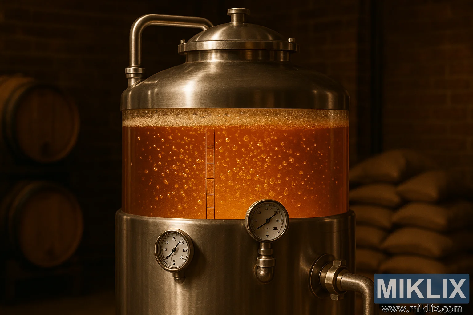 Tässä tunnelmallisessa kuvassa katsoja tempautuu toimivan panimon sydämeen, jossa perinne ja tarkkuus kohtaavat ruostumattomasta teräksestä valmistetun käymissäiliön muodossa. Säiliö on korkea ja hohtava, sen kiillotettu pinta heijastaa huoneen täyttävää lämmintä, kultaista valoa. Tämä pehmeä mutta suuntaava valaistus heittää lempeän hehkun säiliön läpinäkyvän täyttöasteen ilmaisimen läpi näkyvän meripihkanvärisen nesteen yli. Astian sisällä kuplat nousevat jatkuvassa, poreilevassa tanssissa, ja niiden liike on visuaalinen todiste käymisen biokemiallisesta elinvoimaisuudesta. Neste kuohuu ja kimaltelee, mikä viittaa siihen, että hiiva muuntaa aktiivisesti sokereita alkoholiksi ja hiilidioksidiksi – prosessi, joka on yhtä ikivanha kuin itse oluenpano, mutta silti täynnä mysteeriä ja vivahteita.