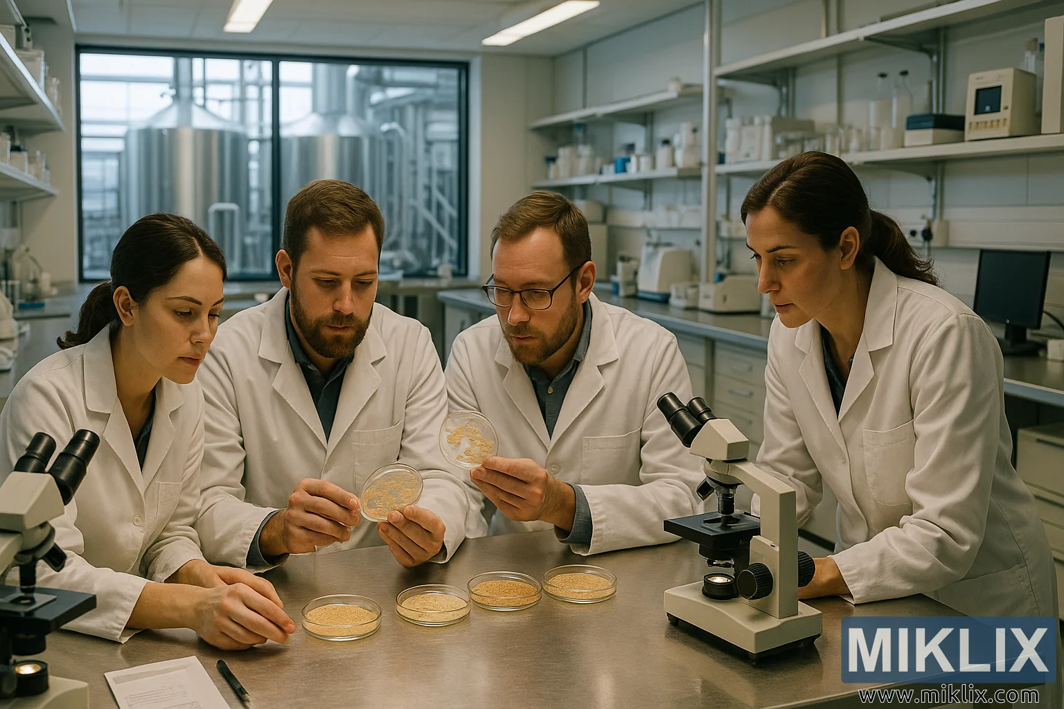 Tämä kuva vangitsee keskittyneen yhteistyön hetken ammattimaisessa laboratoriossa, jossa mikrobiologia kohtaa oluenpanon taiteen. Neljä henkilöä, pukeutuneina rapeisiin valkoisiin laboratoriotakkeihin ja istuen keskellä olevan työpöydän ympärillä, on uppoutunut tutkimaan petrimaljoja. Heidän kehonkielensä ja ilmeensä viittaavat yhteiseen tarkoitukseen, kun he tutkivat mikrobipesäkkeiden kasvumalleja, tekstuureja ja väritystä – todennäköisesti hiivakantoja, joiden käymiskykyä arvioidaan. Pöydän reunalle järjestelmällisesti asetetut petrimaljat toimivat biologisen aktiivisuuden pienoismaisemina, joista jokainen antaa vihjeitä elinkelpoisuudesta, puhtaudesta ja aineenvaihdunnallisesta käyttäytymisestä.