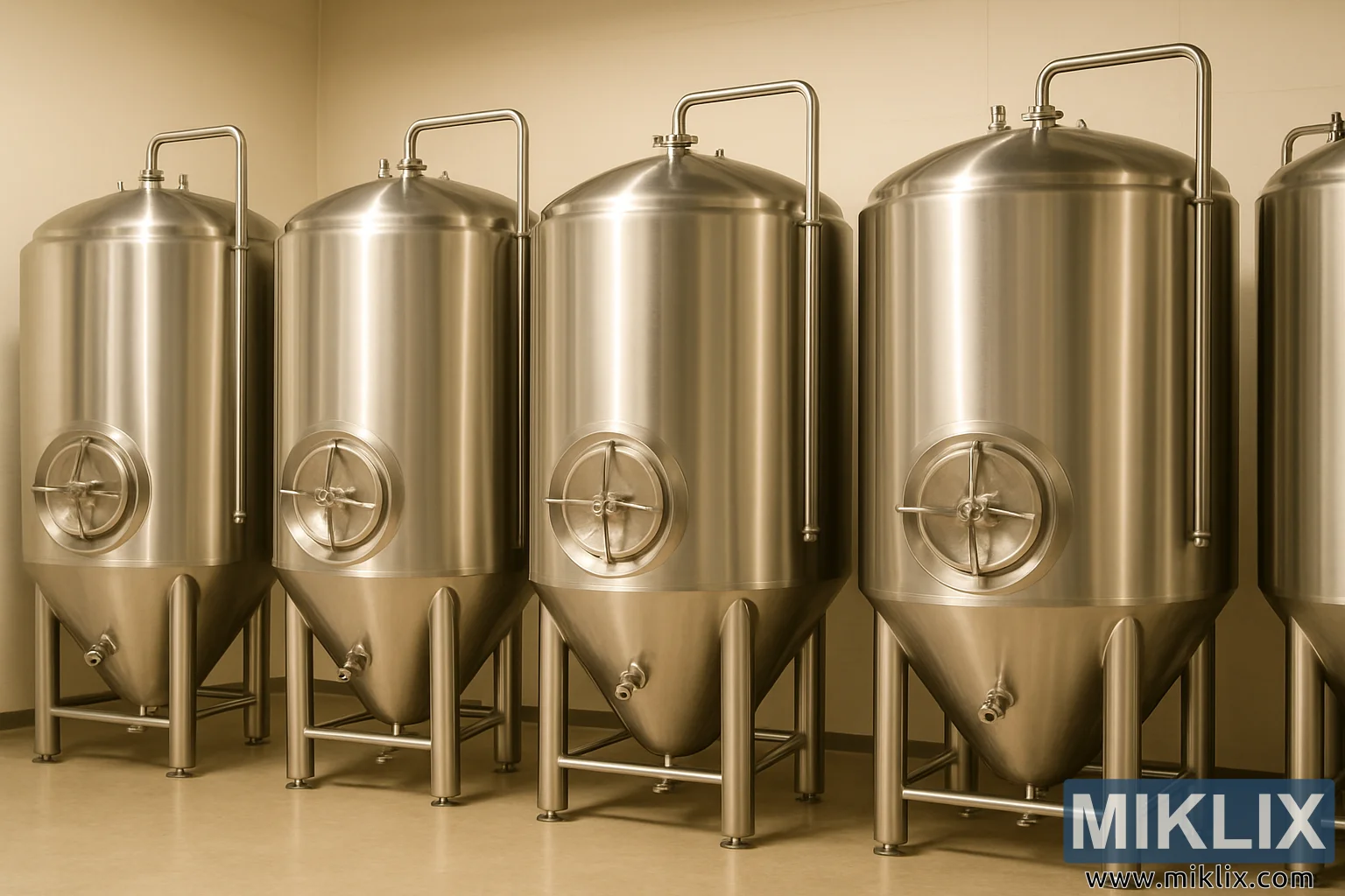 Lähes koko kehyksen vaakasuoran jännevälin peittää neljä korkeaa käymissäiliötä, jotka on sijoitettu vierekkäin suoraan, tasaisesti toisistaan erotettuun linjaan. Niiden järjestely luo rytmisen sylinterimäisten muotojen ja heijastavien pintojen toiston, mikä lisää järjestyksen tunnetta. Jokainen säiliö seisoo neljällä tukevalla, kiillotetulla ruostumattomasta teräksestä valmistetulla jalalla, jotka nostavat säiliöt lattian yläpuolelle jättäen niiden alle vapaata tilaa puhdistusta ja tyhjennysventtiilien käyttöä varten. Kamera on sijoitettu suunnilleen silmien tasolle, ja se näyttää säiliöt edestä ja symmetrisesti, mikä korostaa niiden yhtenäisyyttä.