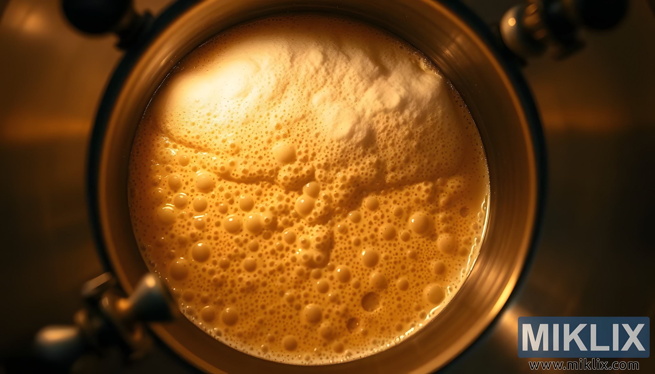 Ruostumattomasta teräksestä valmistettu käymissäiliö, joka on täytetty kuplivalla oluella, vaahdolla päällä ja pehmeällä lämpimällä valaistuksella, joka korostaa aktiivista oluenvalmistusprosessia.