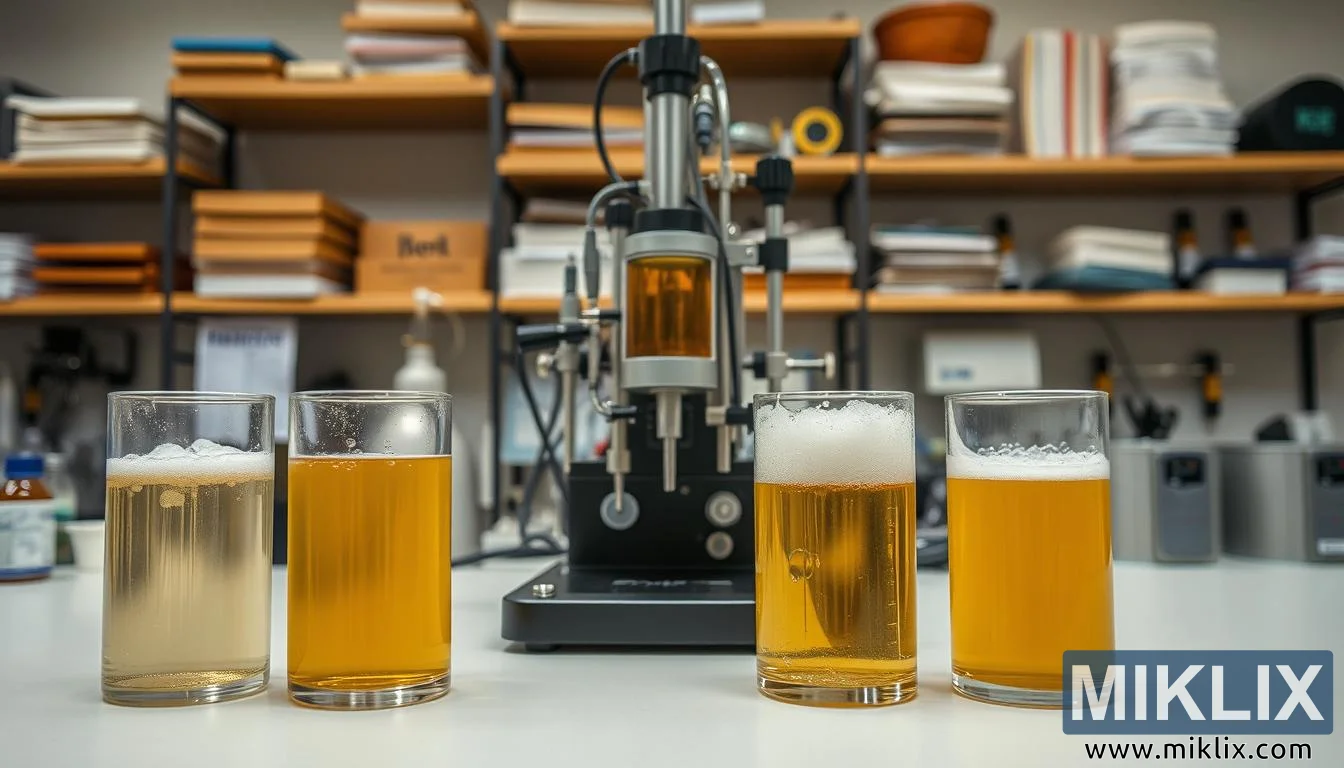 Välimaastossa keskeinen tieteellinen laite symboloi tarkkuutta ja hallintaa. Todennäköisesti tekstuurianalysaattori tai vaahdon stabiiliusmittari on varustettu antureilla ja mittaustyökaluilla, jotka on suunniteltu kvantifioimaan fysikaalisia ominaisuuksia, kuten vaahdon pysyvyyttä, hiilihappopitoisuuksia ja viskositeettia. Sen läsnäolo korostaa kokeen analyyttistä luonnetta, jossa subjektiivista makua täydentävät objektiiviset tiedot. Laite on puhdaslinjainen, moderni ja selkeästi integroitu työnkulkuun, joka arvostaa toistettavuutta ja tarkkuutta. Se kuroa umpeen kuilua perinteisen oluenpanon intuition ja nykyaikaisen tieteellisen tarkkuuden välillä.