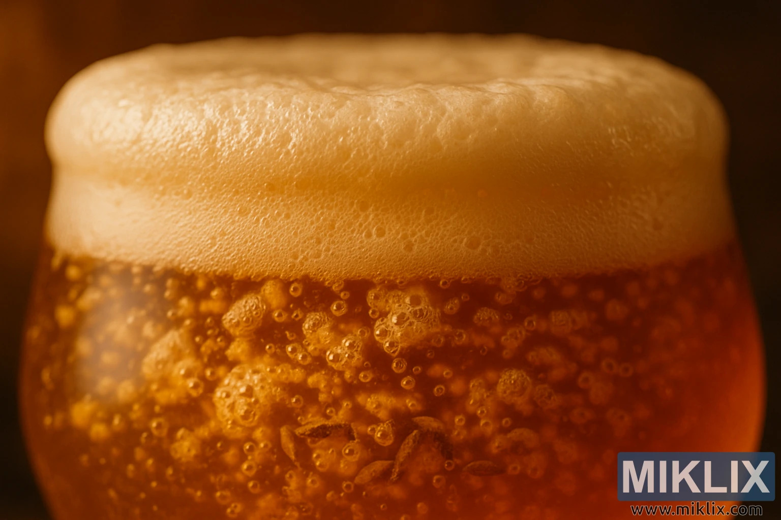 Kapea syväterävyysalue tehostaa katsojan keskittymistä itse olueen. Tausta sumentuu pehmeäksi, epämääräiseksi lämpimän ruskean ja kullan sävyiseksi utuiseksi väreiksi, mikä varmistaa, etteivät häiriötekijät vie huomiota nesteen ja vaahdon monimutkaisilta yksityiskohdilta. Tämä sommitteluvalinta ei ainoastaan eristä kohdetta, vaan myös vahvistaa käymisprosessin taiteellisuutta nostaen sen teknisestä muutoksesta esteettisesti kauniiksi kohteeksi.