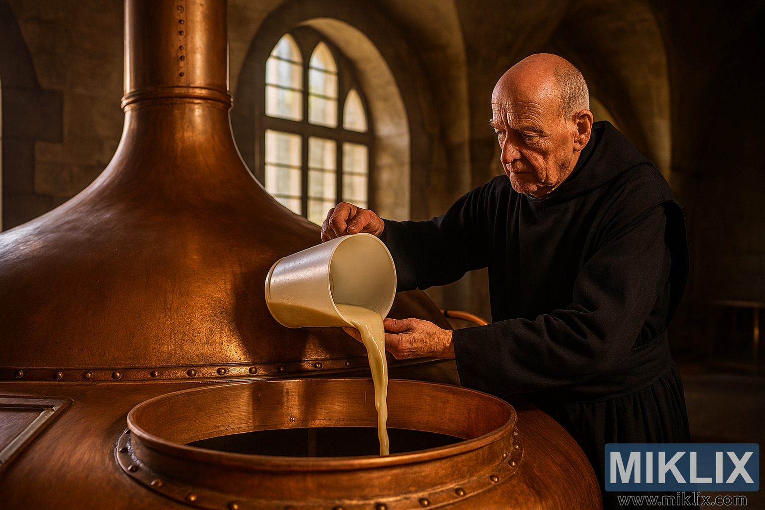 Historiallisessa belgialaisessa luostaripanimossa iäkäs munkki seisoo suuren kuparisen käymissäiliön vieressä ja kaataa nestemäistä hiivaa sen avoimeen suuhun. Munkilla on yllään perinteiset mustat, paksusta villasta tehdyt pitkähihaiset kaavut, joiden huppu laskeutuu alas hänen selälleen. Hänen kasvonsa ovat syvästi ryppyiset, valkoiset otsatukkaiset reunustavat kaljua päätä, ja hänen ilmeensä on vakavan keskittyneen oloinen. Hän pitelee valkoista muoviastiaa molemmilla käsillään ja kallistaa sitä varovasti vapauttaakseen tasaisen virran vaaleankeltaista hiivaa säiliöön. Hiiva virtaa tasaisesti ja heijastaa lämmintä valoa hänen takanaan olevista kaari-ikkunoista.