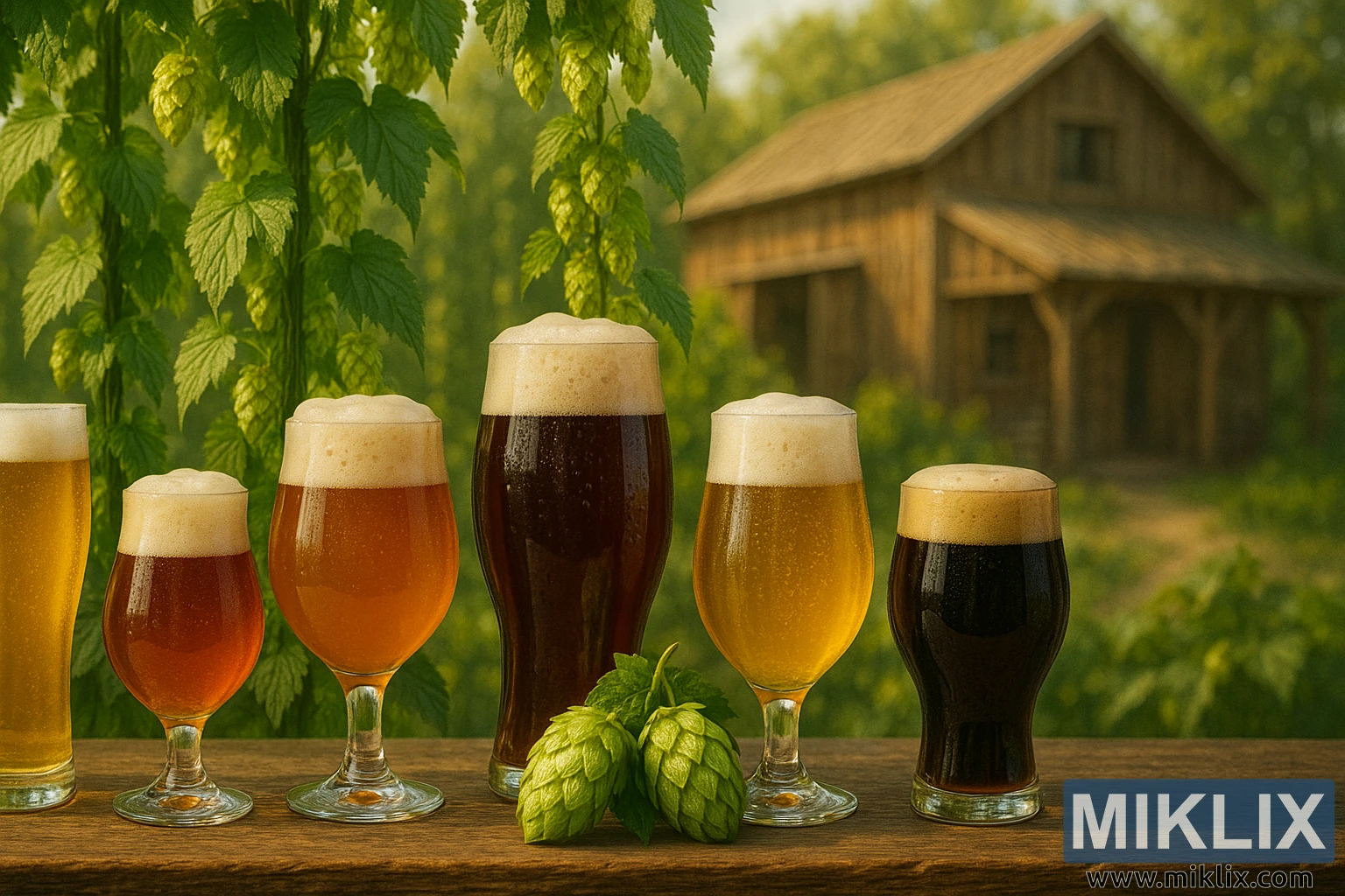 Agnus-humalan oluttyylit: Kuva avautuu kuin juhla panimoperinteelle, taiteellisuudelle ja humalan luonnolliselle kauneudelle eloisimmillaan. Etualalla houkuttelevalla puisella reunuksella on silmiinpistävä rivi kuutta erilaista olutlasia, joista jokainen on kaadettu huolellisesti korostamaan Agnus-humalan mahdollista tyylien laajaa kirjoa. Niiden värit vaihtelevat raikkaan lagerin hohtavasta kullasta tasapainoisen vaalean alen meripihkan lämpöön, syveneen rubiininpunaisiksi aleiksi ja huipentuen stoutin samettiseen pimeyteen. Vaahtoavat, kermaiset ja runsaat vaahdot kruunaavat jokaisen lasin koostumuksella, joka vihjaa sekä tuoreudesta että käsityötaidosta, ja ne heijastavat valoa pehmeissä kohokohdissa, jotka korostavat jokaiseen tuoppiin panostettua huolenpitoa. Yhdessä nämä oluet kertovat tarinan monimuotoisuudesta – siitä, miten yksi humala voi ilmaista itseään lukemattomissa resepteissä tarjoten katkeruutta, kukkaisia aromeja tai hienovaraisia mausteita riippuen siitä, miten panimomestari sen onnistuu valmistamaan.