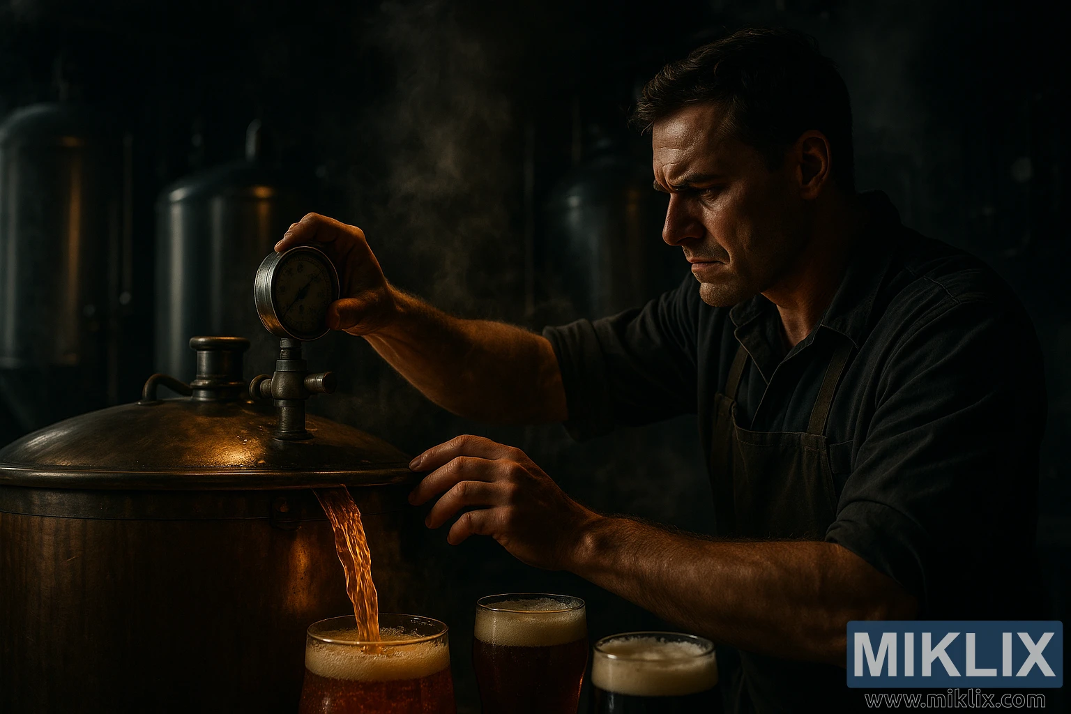 Panimomestari hienosäätää mittaria höyryävässä panimossa meripihkanvärisen vierteen virratessa, mikä korostaa Agnus-humalalla tehdyn oluen tarkkuutta ja taitoa.
