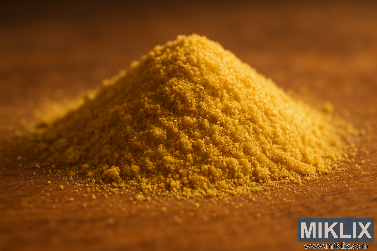 Makrokuva kullankeltaisesta Bravo-humalan lupuliinijauheesta maalaismaisella puulla, jossa sen hienojakoiset rakeet näkyvät lämpimässä, pehmeässä valossa.