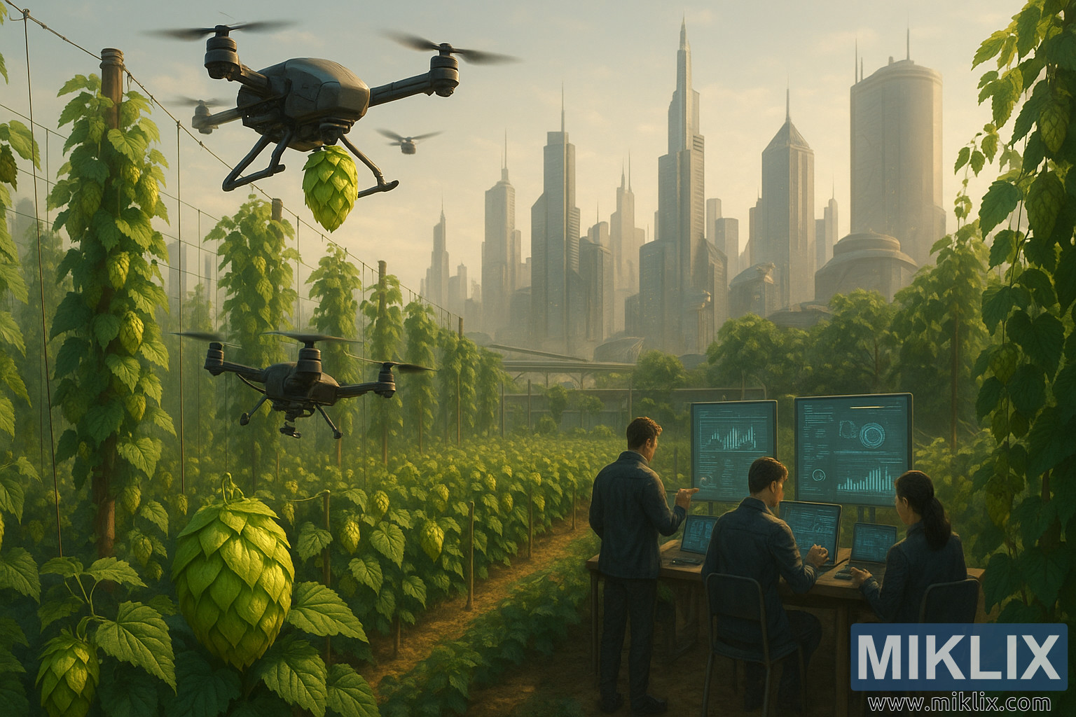 Rehevä humalatila, jossa droonit keräävät satoa ja tutkijat analysoivat dataa futuristisen kaupunkikuvan edessä, korostaen innovaatiota ja kestävää kehitystä.