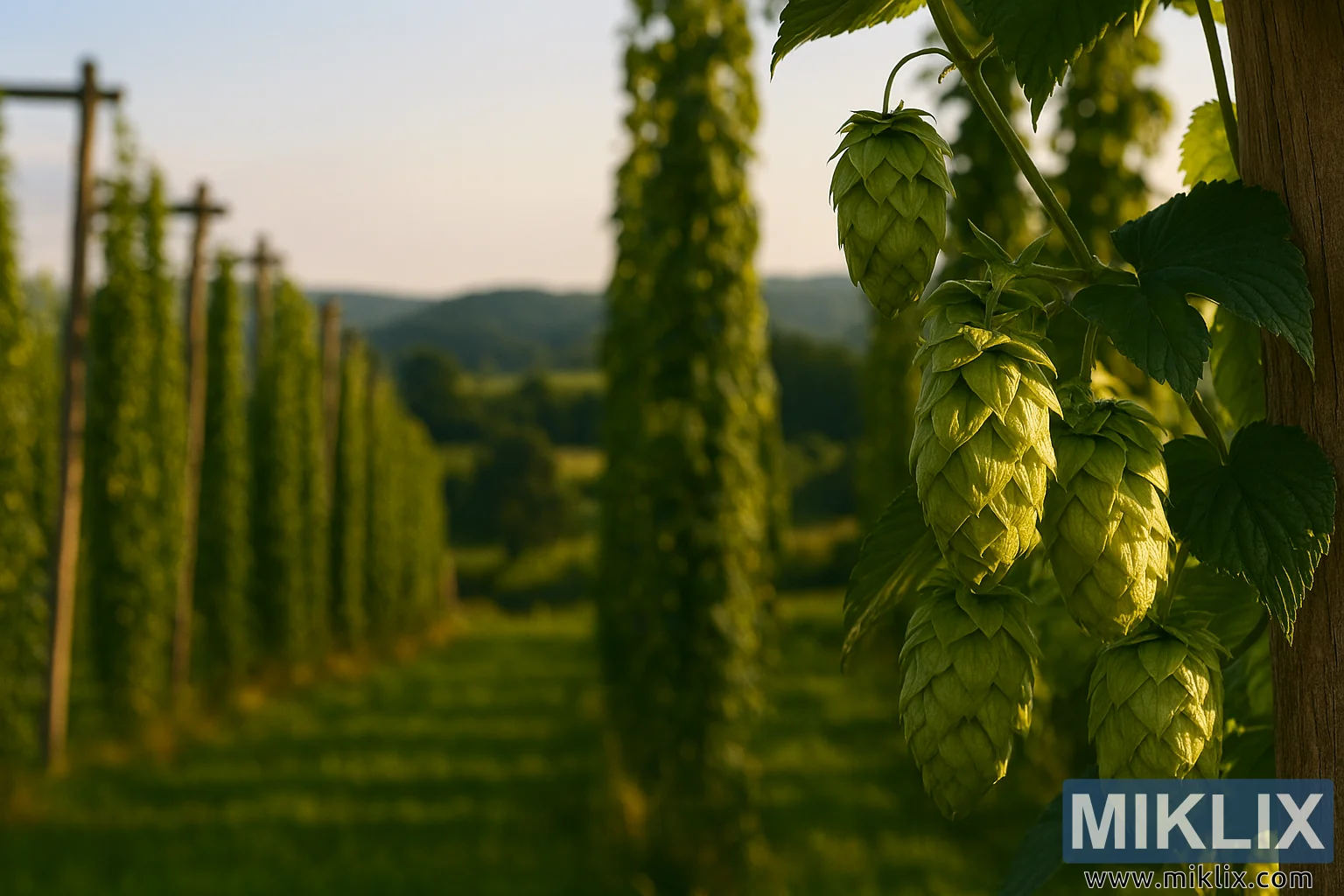 Sovereign Hop Cones in Golden-Hour Field – High-Resolution Agricultural Image
