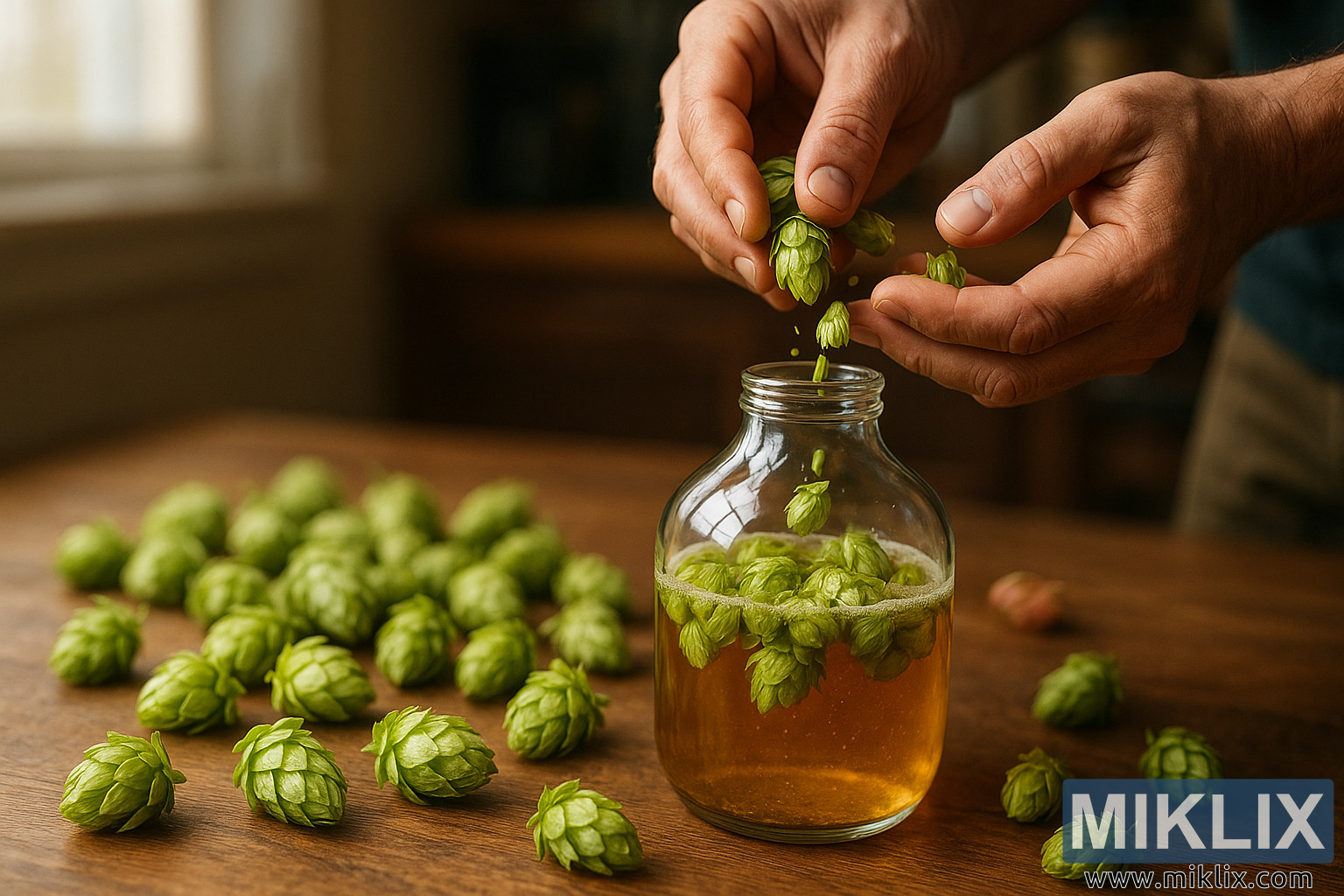 Keskellä kompositiota kaksi kättä tarkentuu, niiden kovettunut iho ja varovaiset liikkeet kertovat kokemuksesta ja omistautumisesta. Panimomestari nipistää pienen rykelmän humalantähkiä peukalon ja etusormen välissä ja laskee ne varovasti leveän, osittain kultaisella nesteellä täytetyn lasipullon suulle. Kontrasti on silmiinpistävä: humalan eloisan vihreä väri vastapäätä kypsyvän oluen meripihkan sävyä. Kun tötteröt liukuvat astiaan, jotkut niistä kelluvat pinnalla, kelluvat hetken ennen kuin vajoavat hitaasti. Niiden tekstuurikerrokset heijastelevat valoa niiden kiertyessä alaspäin. Tämä toiminta ei ole hätäistä, vaan harkittua, ja jokainen lisäys on osa ikivanhaa kuivahumalointiprosessia, jossa humala lisätään keittämisen jälkeen antamaan eloisa aromi ja maku ilman liiallista katkeruutta.
