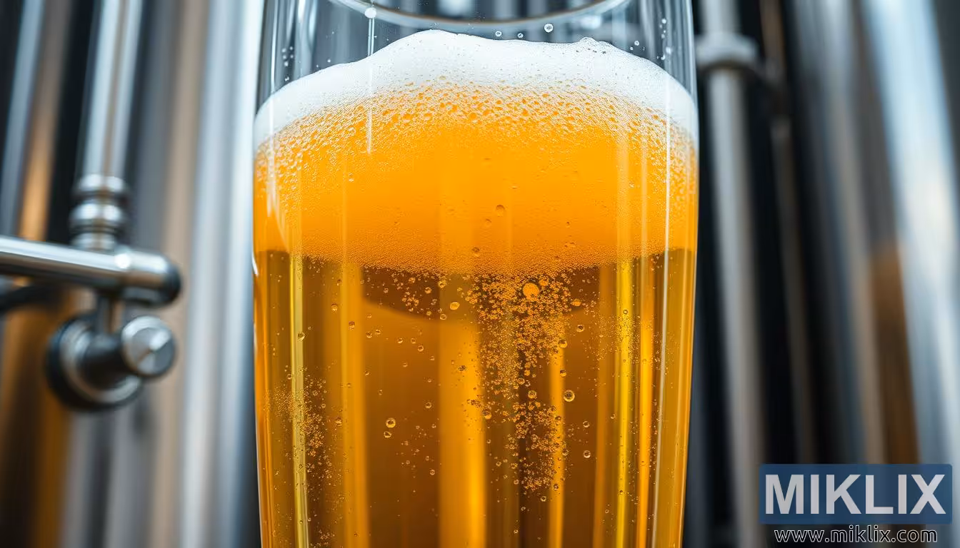 Lasiastiassa näkyy kultaisen pilsner-oluen kupliminen ja vaahtoaminen käymisen aikana, ja taustalla näkyvät ruostumattomasta teräksestä valmistetut laitteet korostavat käsityötaitoa.