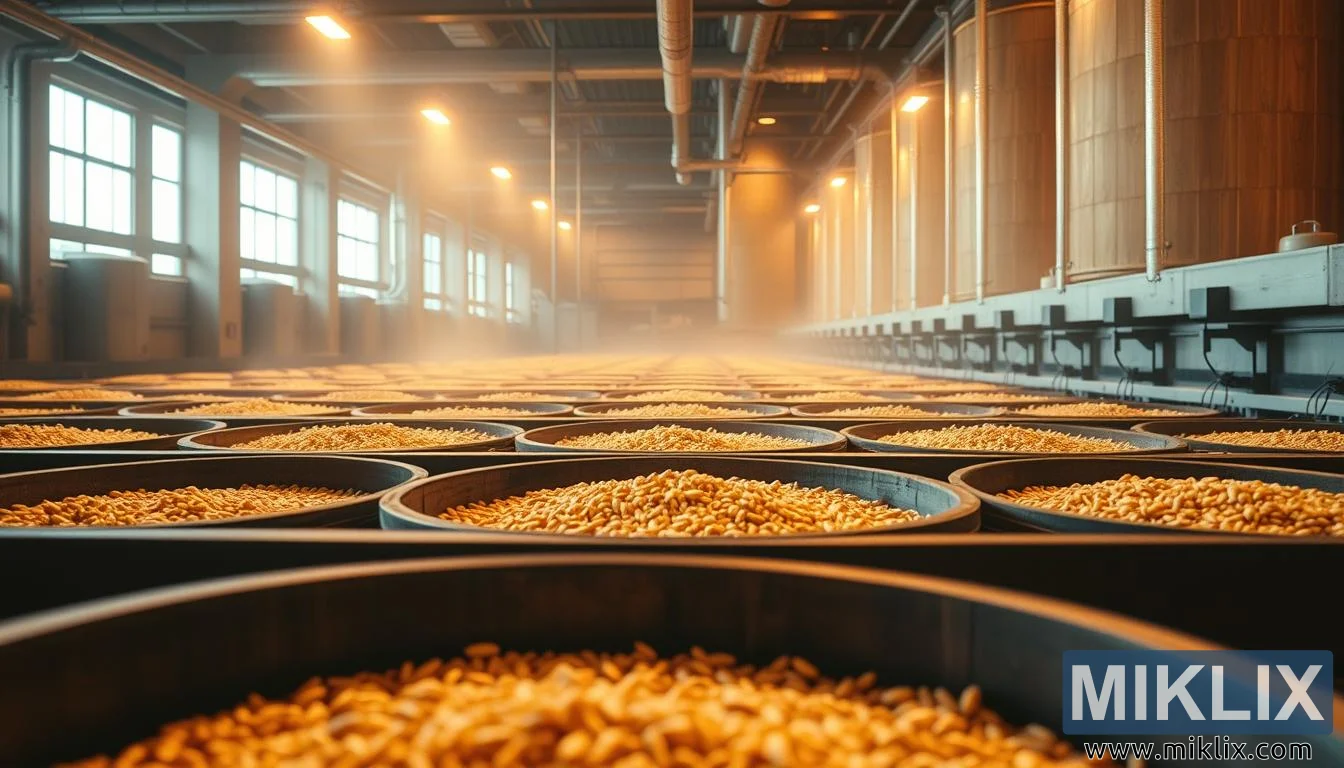 Nykyaikaisen mallastamon avarassa sisätilassa vallitsee hiljainen tarkkuus ja ahkera rauha. Tilaa hallitsevat rivit suuria, pyöreitä astioita – todennäköisesti idätyssäiliöitä tai perinteisiä puisia mallasrumpuja – joista jokainen on täynnä kullanvärisiä ohranjyviä eri muutosvaiheissa. Nämä kooltaan ja väriltään tasaiset jyvät kimaltelevat hienovaraisesti lämpimän, hajavalossa, joka suodattuu korkealla sijaitsevien ikkunoiden ja kattovalaisimien läpi. Valo heittää pehmeän hehkun ohran pinnalle valaisten akanoiden hienovaraiset tekstuurit ja jyväpetien lempeät aaltoilut luoden visuaalisen rytmin, joka vetää katseen syvemmälle laitokseen.