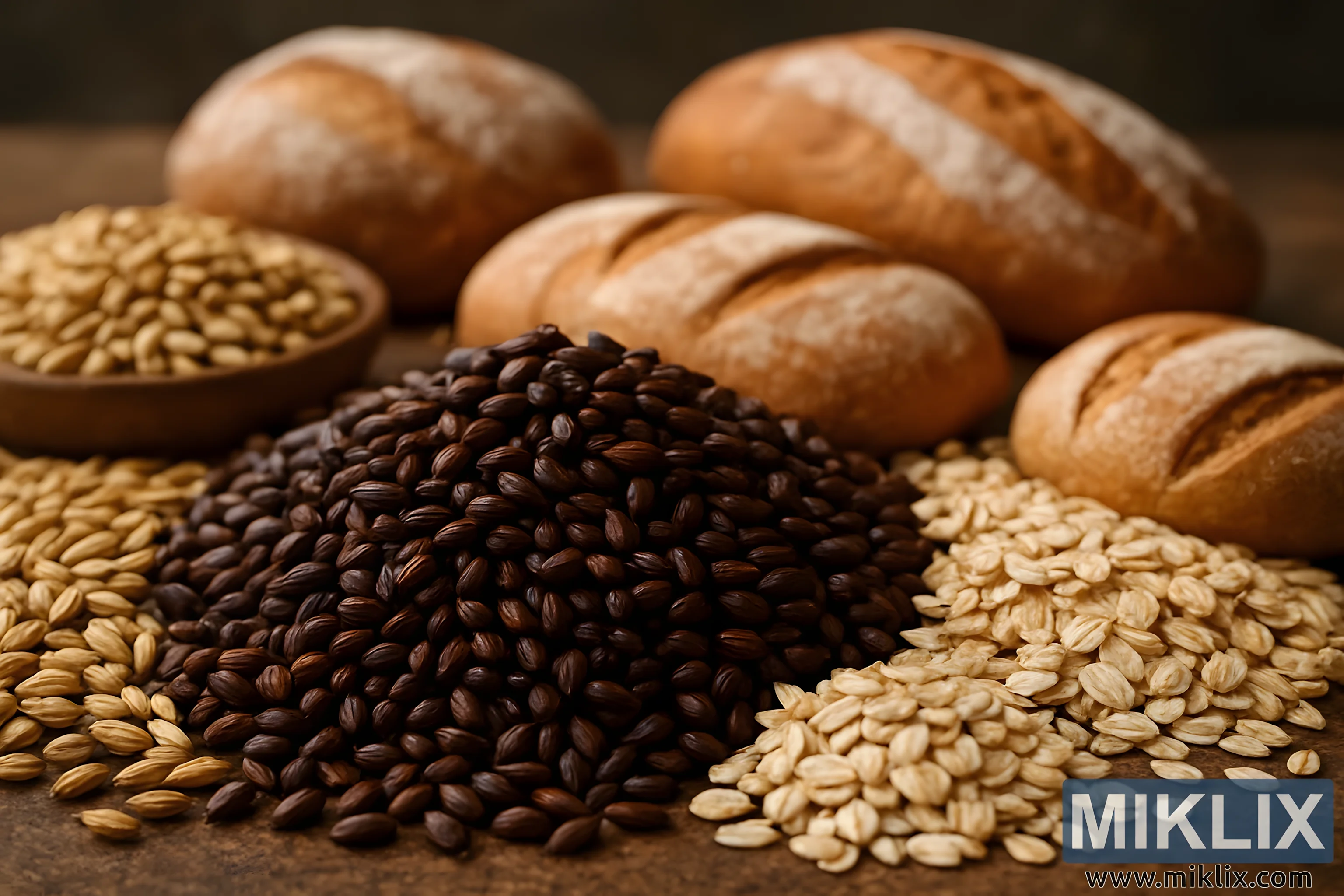 Tässä rikkaasti teksturoidussa asetelmassa kuva vangitsee raakojen maataloustuotteiden ja niiden muuntumisen ravitsevaksi, käsintehdyksi ruoaksi välisen läheisen suhteen. Kompositio on harkitusti aseteltu korostamaan jyvien monimuotoisuutta ja kauneutta, erityisesti painottaen suklaamallaksen syviä, paahdettuja sävyjä. Etualalla runsas kasa suklaamallasjyviä ankkuroi kuvauksen, niiden kiiltävät, tummanruskeat pinnat heijastavat pehmeää, hajavaloa. Nämä jyvät rikkaine sävyineen ja hieman epäsäännöllisine muotoineen tuovat mieleen hitaan paahtamisen lämmön ja niiden sekä oluenpanoon että leivontaan tuoman monimutkaisen maun. Niiden läsnäolo kiinnittää välittömästi katseen ja tarjoaa visuaalisen ja aistittavissa olevan kontrastin niitä ympäröiville vaaleammille jyville.