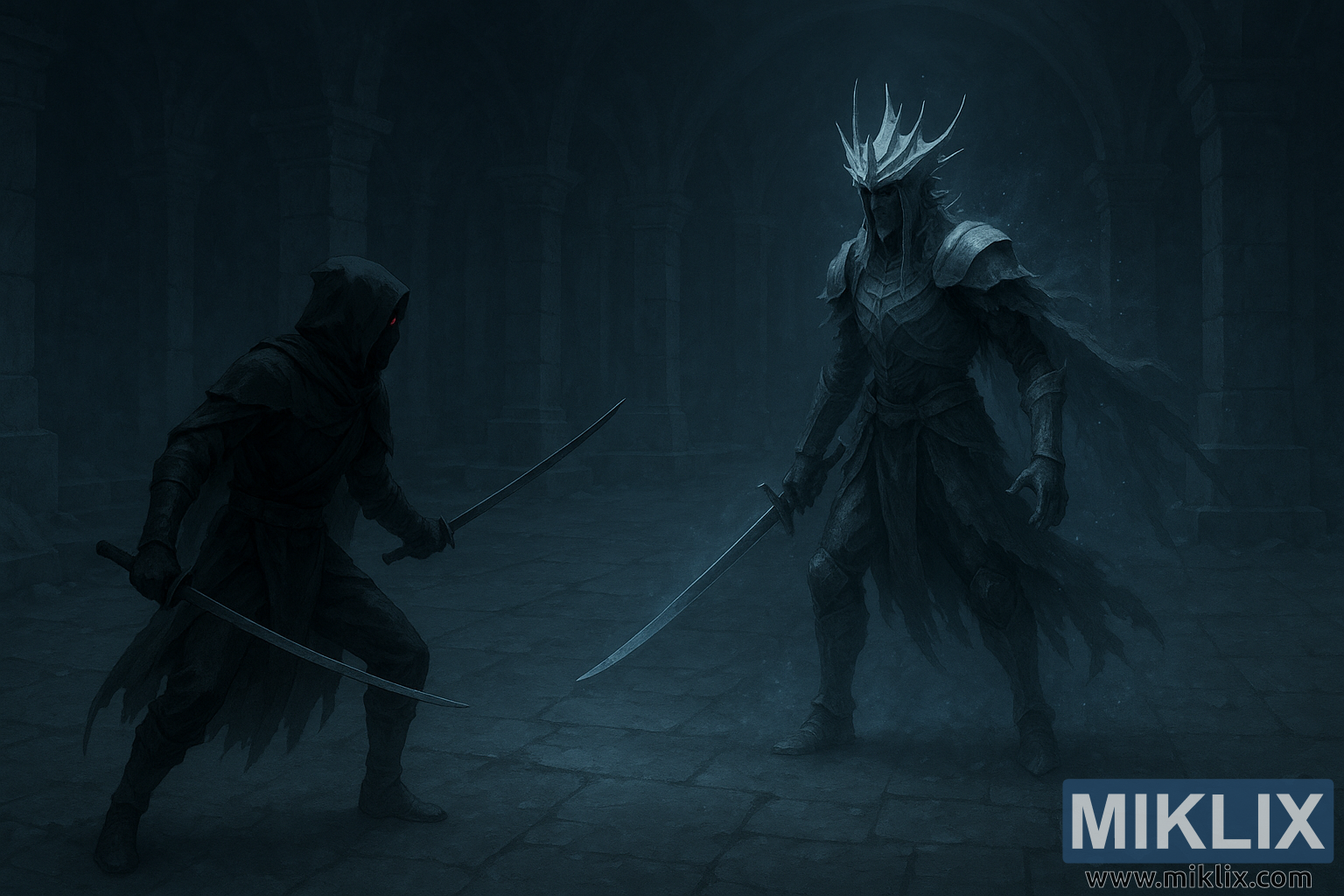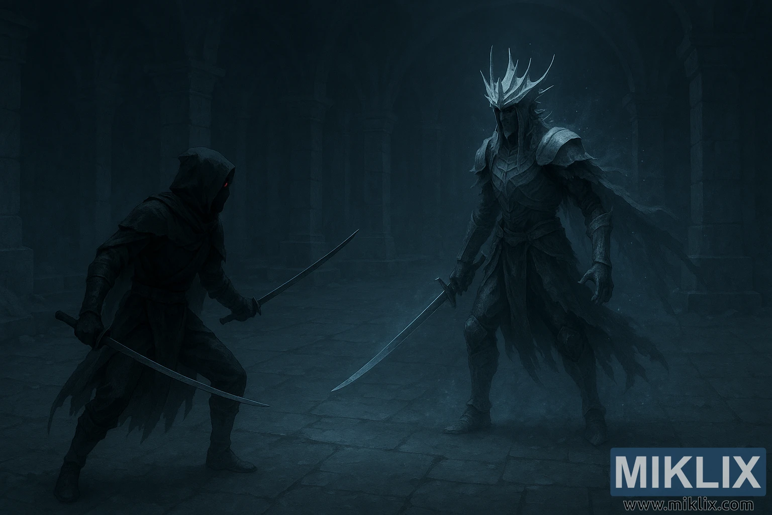 Vasemmalla seisoo Mustan Veitsen soturi, viitoitettuna repaleiseen, varjojen kastelemaan kankaaseen, joka sulautuu ympäröivään hämärään. Heidän siluettinsa on kapea, ketterä ja tappava, huppu heijastaa heidän kasvonsa pimeyteen lukuun ottamatta yhtä hehkuvaa punaista silmää, joka palaa ympäristön kylmän sävyn läpi. Heillä on kaksi kaarevaa terää, molemmat tasapainoisessa, taisteluvalmiissa asennossa – toinen kohotettuna lähellä rintaa, toinen matalalla lähellä maata. Terävät reunat heijastavat kammion ympäröivän sinisen valon himmeitä heijastuksia, antaen niille metallisen hohteen varjoja vasten. Viitan hienovarainen liike viittaa valmiuteen ja jännittyneisyyteen, ikään kuin salamurhaaja olisi valmis syöksymään eteenpäin minä hetkenä hyvänsä.