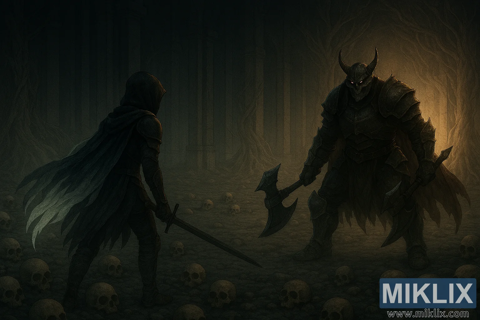 Hänen vastapäätä Kuolemanritari häämöttää korkeana, sarvipäisenä hahmona, joka on pukeutunut rosoiseen, tummuneeseen haarniskaan, jossa on kultaisia yksityiskohtia ja kerrostettuja levyjä. Hänen kypäränsä muistuttaa kruunattua kalloa, jonka hehkuvat punaiset silmät lävistävät hämärän. Rähjäinen tummanpunainen viitta roikkuu hänen hartioillaan, ja kummassakin kädessään hän pitelee massiivista kaksipäistä taistelukirvestä, joiden terät ovat kuluneet ja veren tahrimat. Hänen ryhtinsä on leveä ja aggressiivinen, polvet koukussa ja kirveet ylhäällä, valmiina iskemään.