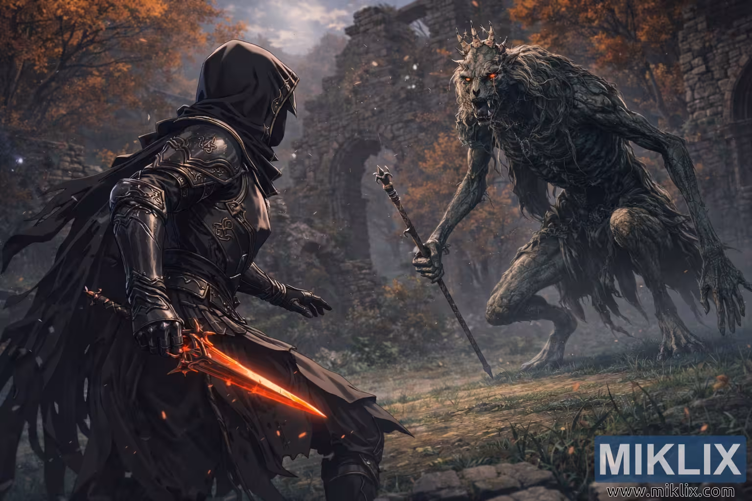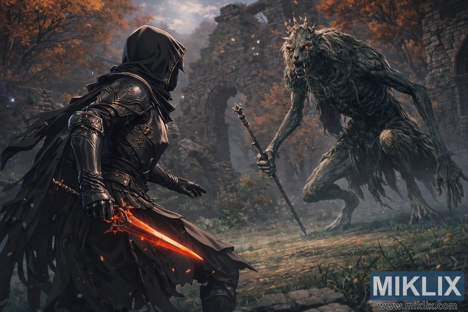 Tämä animesta inspiroitunut digitaalinen kuvitus vangitsee jännittyneen taistelua edeltävän hetken muinaisen metsänraunioiden murenevien kivijuurien keskelle. Kohtaus avautuu hämärässä himmeän, pilvisen taivaan alla, missä vaimeat valonsäteet siivilöityvät syksyn väristen puiden latvustojen ja leijuvan usvan läpi. Sammaleen peittämät kaaret ja halkeilevat kivimuurit kohoavat taustalla, niiden pinnat ovat syöpyneet iän ja luonnon hitaan toipumisen jäljiltä, kun taas hajallaan olevat lehdet ja kostean ruohon laikut peittävät maan. Vasemmalla etualalla seisoo Tarnished, pukeutuneena tyylikkääseen Black Knife -haarniskaan, joka on tehty kiiltävillä obsidiaanin sävyillä ja hienovaraisilla metallinheijastuksilla. Haarniskan ääriviivat ovat terävät mutta elegantit, ja siinä on kerrostettuja levyjä ja monimutkaisia kaiverruksia, jotka vihjaavat hiiviskelyyn keskittyneeseen muotoiluun. Tumma huppu peittää osittain soturin kasvot, jättäen näkyviin vain siivun määrätietoisesta katseesta, mikä vahvistaa mysteerin ja valmiuden auraa. Tarnishedin asento on varovainen mutta tasapainoinen, toinen jalka hieman eteenpäin, hartiat puolustuskannalle kulmassa ja hehkuva karmiininpunainen tikari alhaalla mutta valmiina, sen hiilimäinen valo heittää lämpimiä heijastuksia ympäröivään ruohoon ja haarniskan alareunoihin.