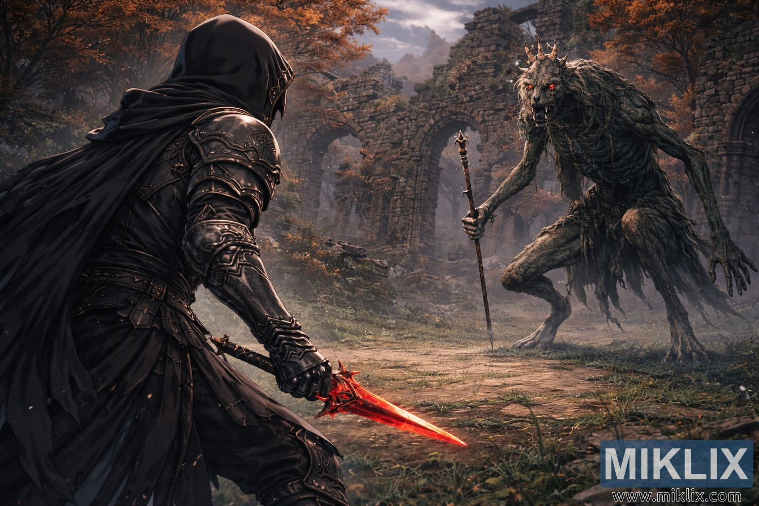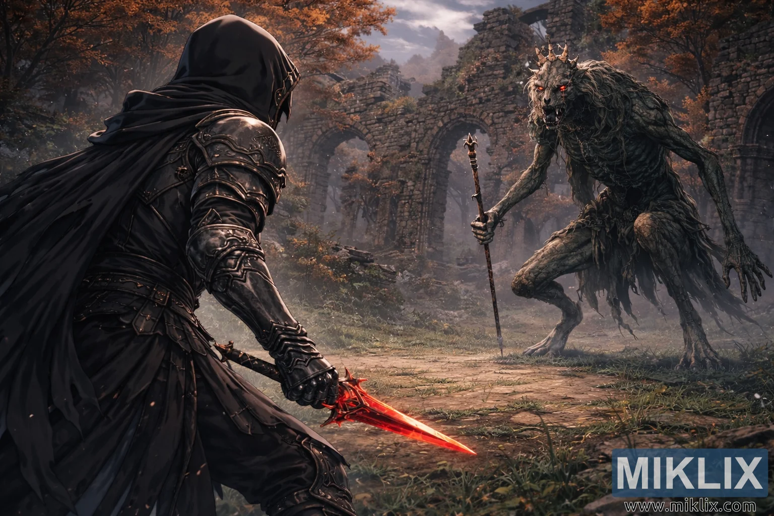 Tämä animesta inspiroitunut digitaalinen kuvitus kuvaa jännittynyttä ja elokuvamaista taistelua edeltävää kohtaamista, joka sijoittuu muinaisen metsän raunioiden umpeenkasvaneisiin kivijäänteisiin hämärän aikaan. Kompositio on aseteltu laajaan vaakasuuntaiseen orientaatioon, joka korostaa tilan syvyyttä ja emotionaalista jännitystä, ja katsoja on sijoittunut aivan Tarnished-soturin taakse ja hieman vasemmalle puolelle. Tarnished on kuvattu osittain takaapäin, jolloin laaja musta viitta ja kerrostettu Musta Veitsi -haarniska hallitsevat etualaa. Haarniska on tehty kiiltävillä obsidiaanin sävyillä ja hienovaraisilla metallisilla kohokohdilla, jotka heijastavat himmeää ympäristön valoa paljastaen kaiverrettuja kuvioita ja hienovaraisesti muotoiltuja levysegmenttejä hartioilla, käsivarsilla ja vyötäröllä. Huppu peittää suurimman osan hahmon päästä, jättäen näkyviin vain himmeän siluetin leuasta ja poskesta, mikä luo nimettömyyden ja hiljaisen päättäväisyyden auran. Tarnishedin oikeassa kädessä lepää lyhyt tikari, joka hehkuu kirkkaalla karmiininpunaisella hiilen kaltaisella valolla, ja sen tulinen terä heijastaa lämpimiä heijastuksia lähellä olevaan ruohoon, viitan laskoksiin ja alempiin haarniskalevyihin. Soturin ryhti on varovainen ja maadoittu, polvet hieman koukussa ja vartalo eteenpäin kallistuneena, mikä viestii valmiutta ilman aggressiivisuutta, ikään kuin arvioiden edessä olevaa uhkaa.