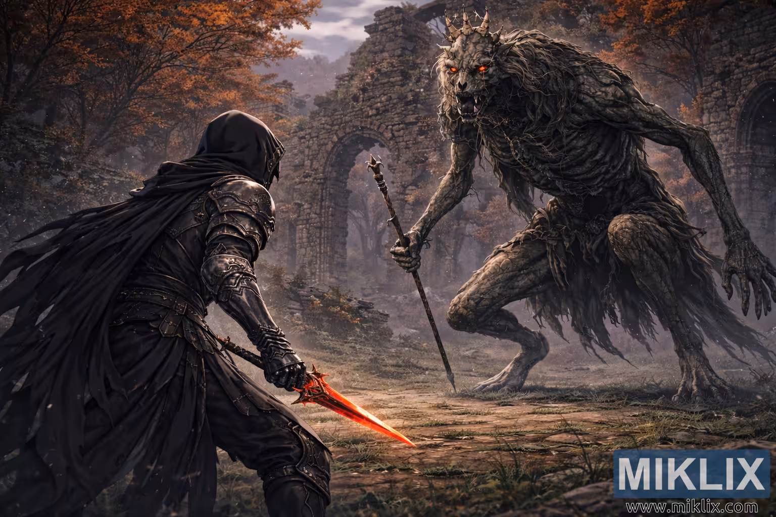 Tämä animesta inspiroitunut digitaalinen kuvitus esittää dramaattisen taistelua edeltävän pattitilanteen muinaisen metsäsuojelualueen murenevien raunioiden keskellä hämärässä. Kompositio on toteutettu laajassa elokuvamaisessa maisemamuodossa, jossa korostetaan mittakaavaa ja jännitystä vahvan etualan ja taustan välisen perspektiivin avulla. Katsojan näköalapaikka on hieman Tarnished-soturin takana ja vasemmalla puolella, mikä luo mukaansatempaavan olkapään yli ulottuvan näkökulman, joka sijoittaa yleisön suoraan kohtaukseen. Tarnished-soturin kuva on vasemmalla etualalla, osittain kääntyneenä poispäin, antaen laajan tumman viitan ja kerroksellisen Mustan Veitsen haarniskan hallita visuaalista lähtökohtaa. Haarniska on kuvattu syvin obsidiaanin ja hiilen sävyin, ja siinä on hienovaraisia metallisia heijastuksia, jotka heijastavat viileää ympäristön valoa paljastaen kaiverrettuja kuvioita ja segmentoituja levyjä hartioilla, hansikkaissa ja vyötäröllä. Huppu peittää useimmat kasvonpiirteet, jättäen näkyviin vain profiilin himmeän ääriviivan, mikä vahvistaa anonymiteettiä ja hiljaista päättäväisyyttä. Soturin oikeassa kädessä lepää lyhyt tikari, joka hehkuu kirkkaan karmiininpunaista energiaa, ja sen hiilimäinen valaistus heittää lämpimiä valoja läheiseen ruohoon, viitan helmaan ja alempiin haarniskalevyihin. Tarnishedin asento on maadoittu ja varovainen, polvet hieman koukussa ja vartalo eteenpäin kallistuen, mikä viittaa valmiuteen ilman avointa aggressiota.