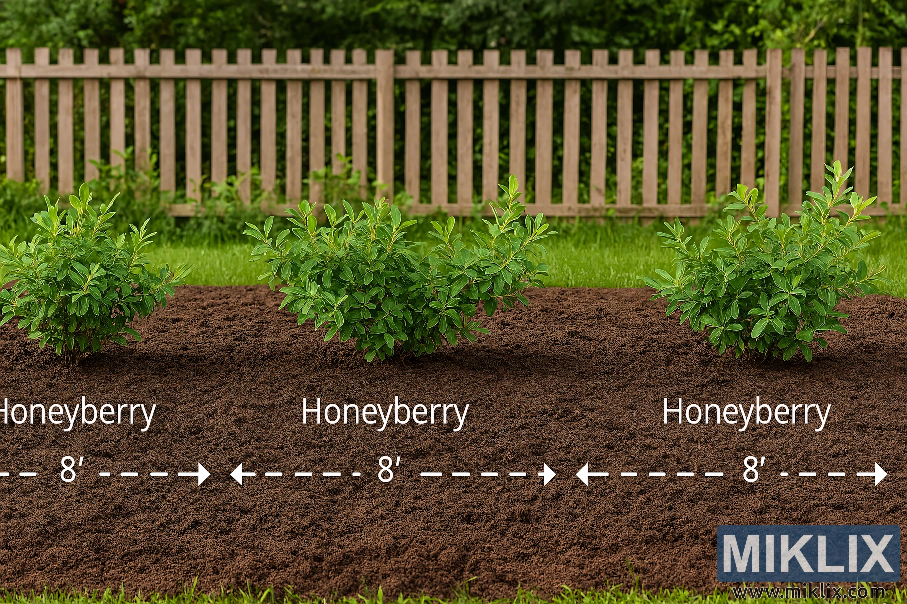 Maisemapuutarhakuva, jossa on istutettu hunajameljoja optimaalisella 2,4 metrin välein, selkeät mittakerrokset ja yksinkertainen puinen aita taustalla.