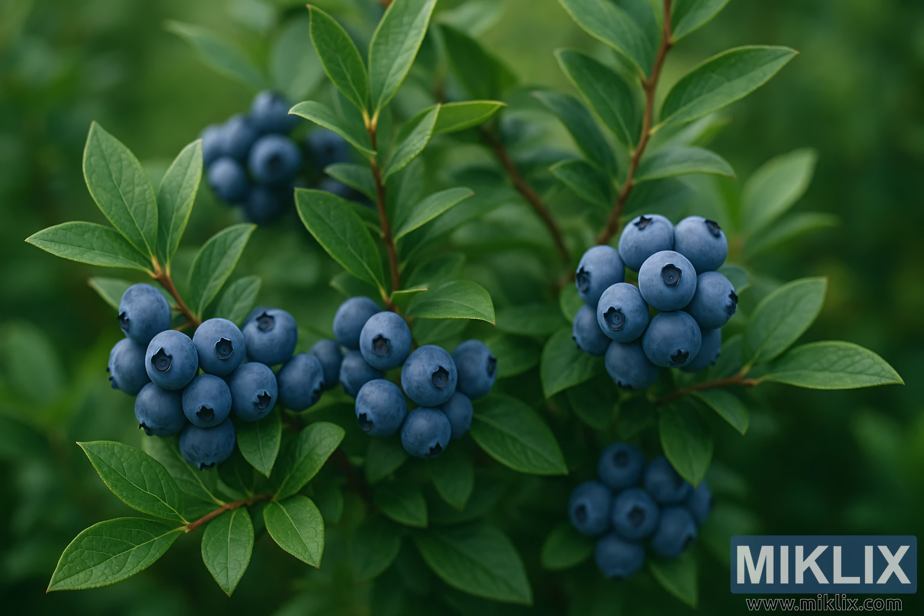 Tämä korkearesoluutioinen maisemavalokuva vangitsee pohjoisen korkeapensaan mustikan (Vaccinium corymbosum) täydessä hedelmäntuottamassaan. Kompositio keskittyy useisiin kypsien mustikoiden terttuihin, joiden syvän indigonsinistä sävyä korostaa luonnollinen puuterainen kukinta, joka antaa jokaiselle marjalle pehmeän, mattapintaisen ulkonäön. Marjat vaihtelevat hieman kooltaan ja muodoltaan, mikä heijastaa luonnollista kasvun vaihtelua, ja ne on järjestetty tiiviiksi tertuiksi, jotka roikkuvat kauniisti hoikista, punertavanruskeista varsista. Pensaan lehdet ovat eloisan, kiiltävän vihreät, pitkänomaiset ja soikeat, ja niissä on sileät reunat ja näkyvät keskisuonet, jotka muodostavat rehevän taustan, joka on kauniisti kontrastissa sinisen hedelmän kanssa. Jokainen lehti vastaanottaa hajavaloa eri tavalla, mikä luo hienovaraisia sävyn vaihteluita smaragdinvihreästä oliivinvihreään ja edistää sommitelman orgaanista rytmiä.