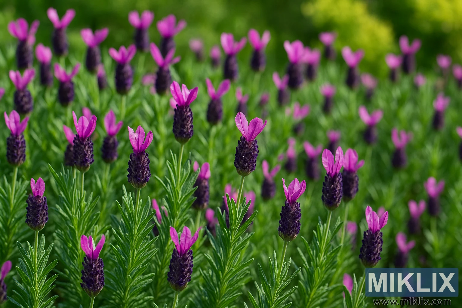 Tämä eloisa lähikuva vangitsee kauniisti ranskalaisen laventelin (Lavandula stoechas) silmiinpistävän kauneuden ja omaleimaisen luonteen. Tämä Välimeren laji tunnetaan koristeellisista kukinnoistaan, elegantista lehdistään ja näyttävistä suojuslehdistään. Kuvassa näkyy kukoistava ranskalaisten laventelilajikkeiden ryhmä täydessä kukassa lämpimässä kesäauringossa. Niiden rohkeat värit ja veistokselliset muodot luovat visuaalisesti kiehtovan kokonaisuuden, joka ilmentää aurinkoisen mökin tai välimerellisen puutarhan viehätystä.