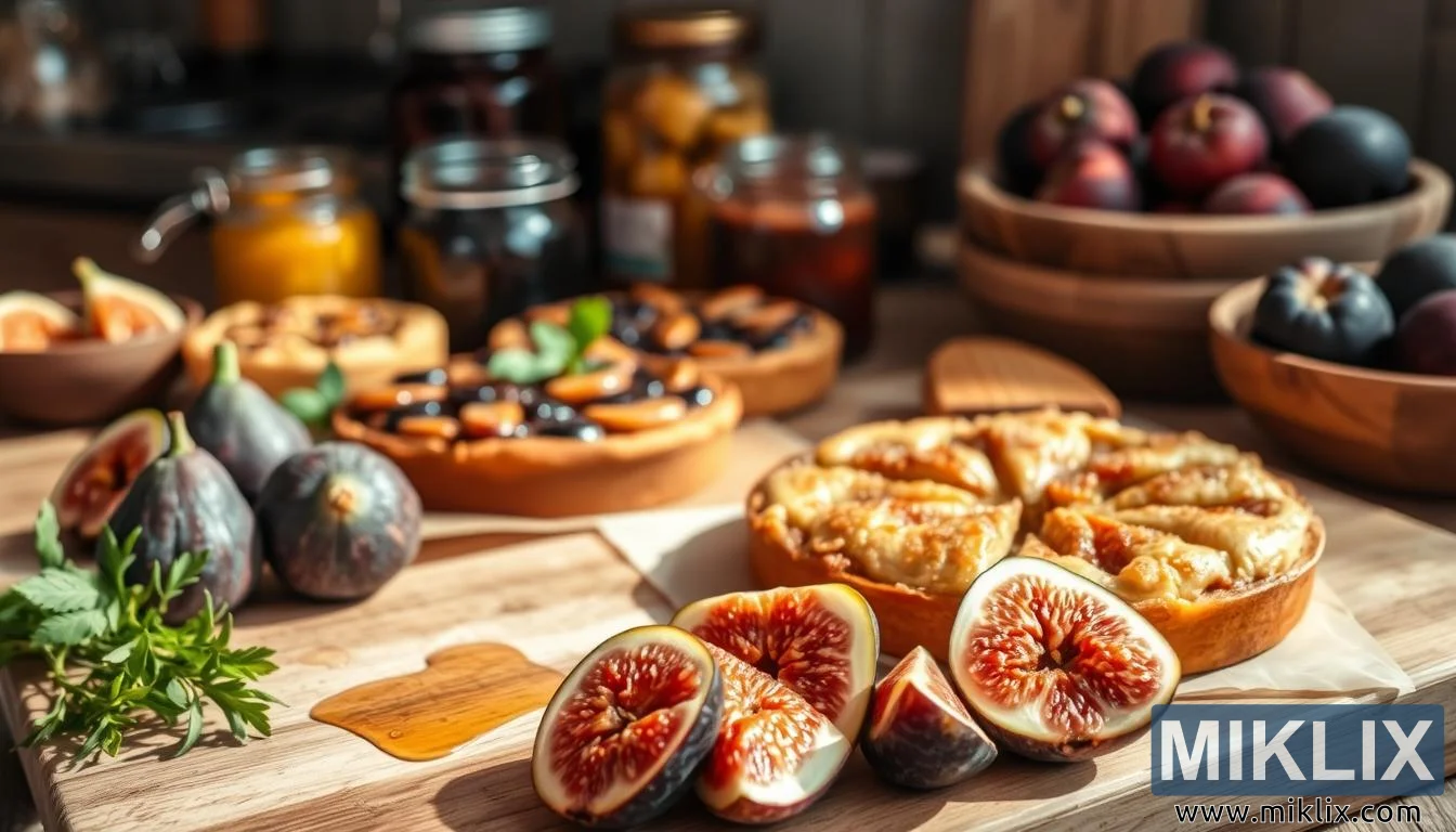 Lämmin asetelma tuoreista viikunoista, hunajasta, yrteistä ja viikunapohjaisista leivonnaisista, joka havainnollistaa viikunoiden monipuolisuutta ja terveyshyötyjä ruoanlaitossa.
