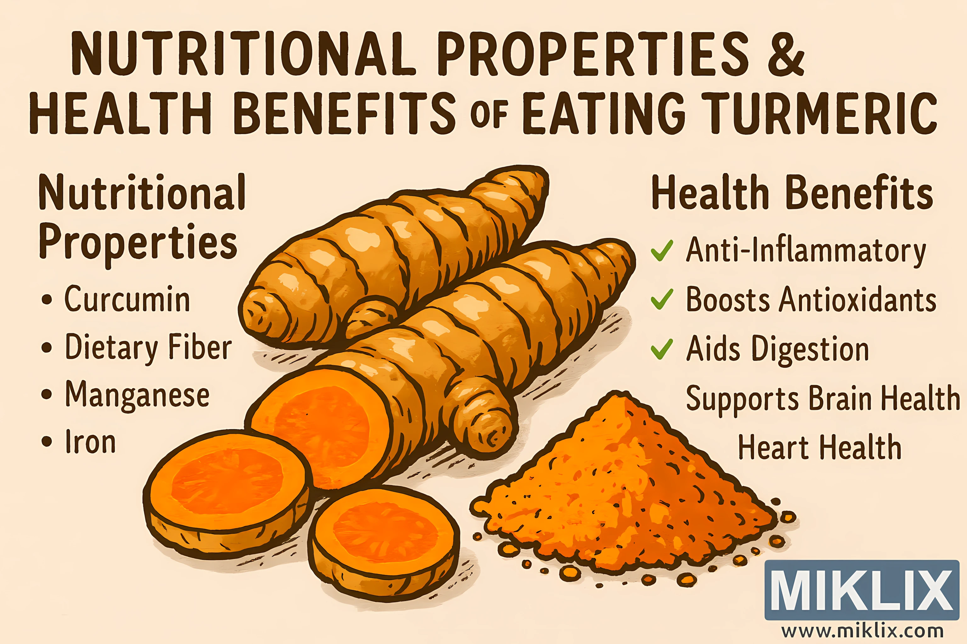 Tämä opettavainen kuvitus esittelee kurkuman ravintoarvoja ja terveyshyötyjä visuaalisesti kiinnostavan asettelun avulla. Kuvassa on käsin piirrettyjä elementtejä, kuten kokonaisia kurkuman juuria, viipaloituja kurkumalohkoja ja kulho kurkumajauhetta, jotka kaikki on tehty lämpimin kullanruskein sävyin, jotka tuovat mieleen mausteen eloisan värin ja maanläheisen luonteen. Kuva on jaettu kahteen selkeästi merkittyyn osioon: "Ravitsemukselliset ominaisuudet" ja "Terveyshyödyt".