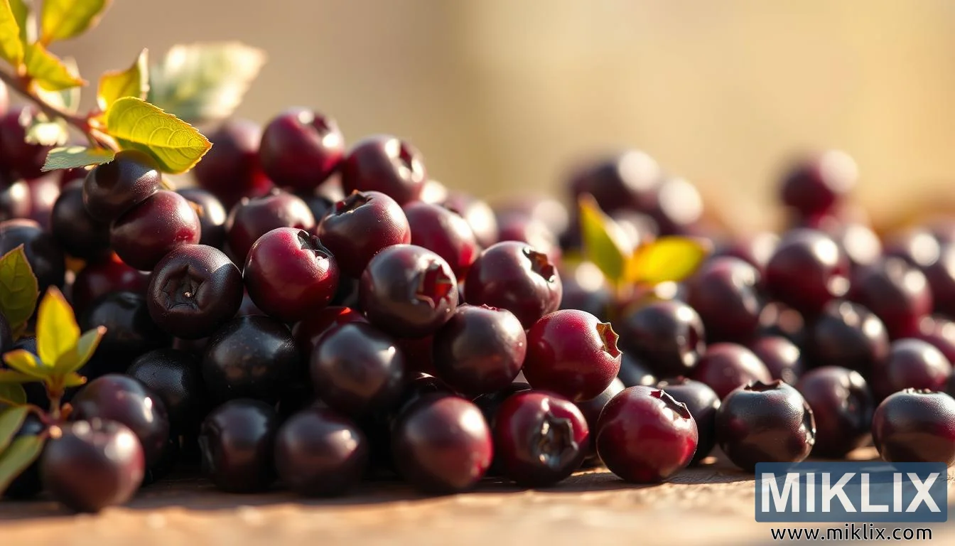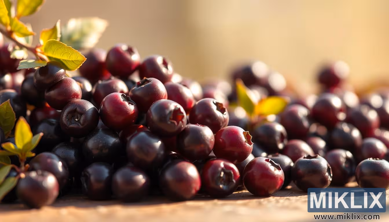 Lähikuva tuoreista aroniamarjoista lämpimässä luonnonvalossa, jossa näkyvät niiden syvän violetti sävy, kiiltävä rakenne ja immuunijärjestelmää vahvistavat hyödyt.