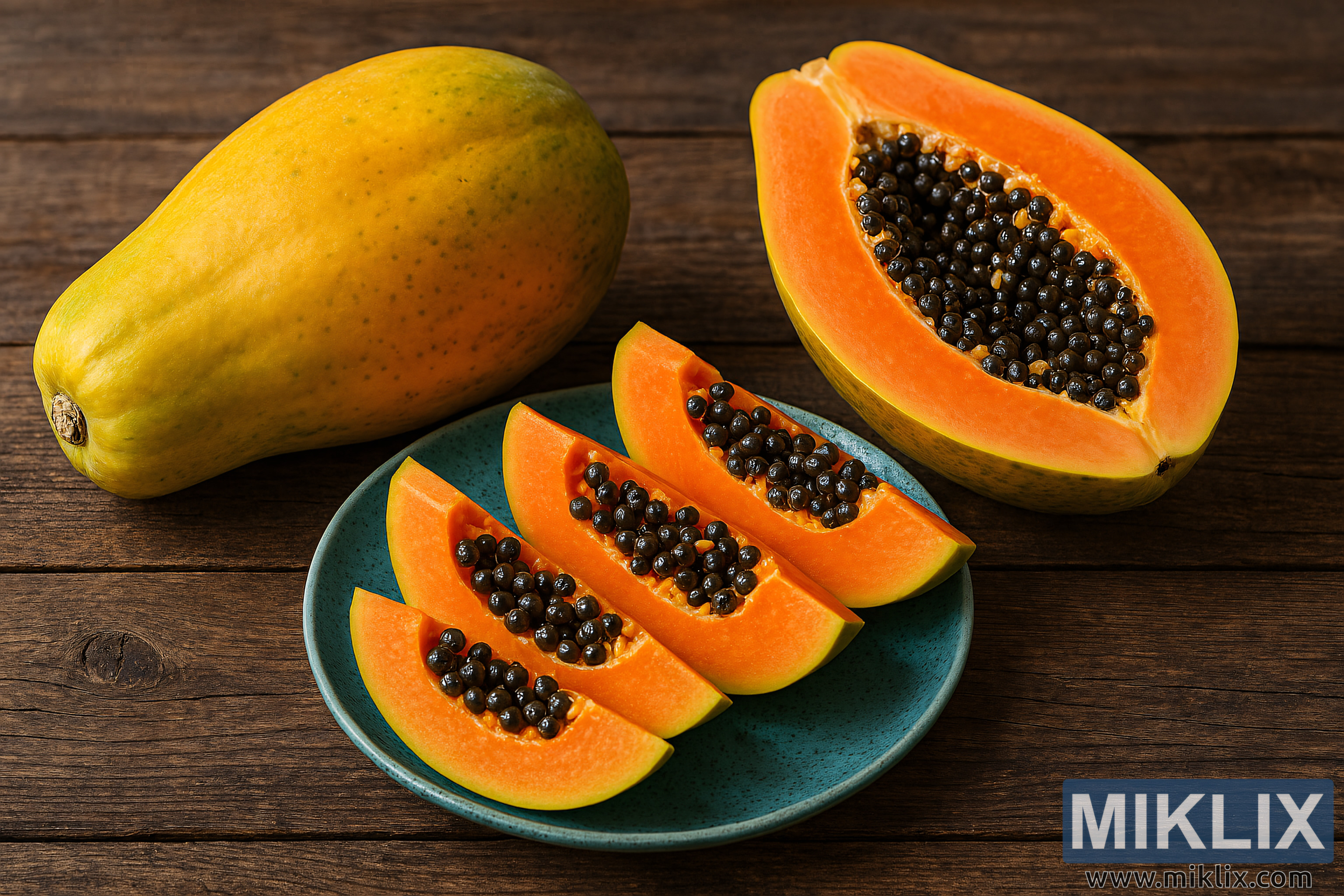 Valaistus on pehmeää ja hajautettua, heittäen lempeitä varjoja ja korostaen hedelmien ja puun tekstuureja. Kokonaispaletti sisältää lämpimiä oransseja ja keltaisia sävyjä papaijoista, syvän ruskeita ja harmaita sävyjä pöydästä sekä viileän syaanin sävyjä lautasesta. Kuva tuo mieleen raikkautta, luonnonkauneutta ja maalaismaisen kulinaarisen tunnelman, joten se sopii erinomaisesti luettelointiin, koulutuskäyttöön tai trooppisiin hedelmiin tai maatilalta pöytään -estetiikkaan keskittyvään mainossisältöön.