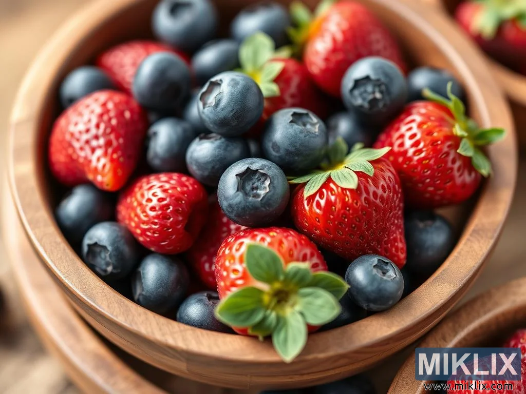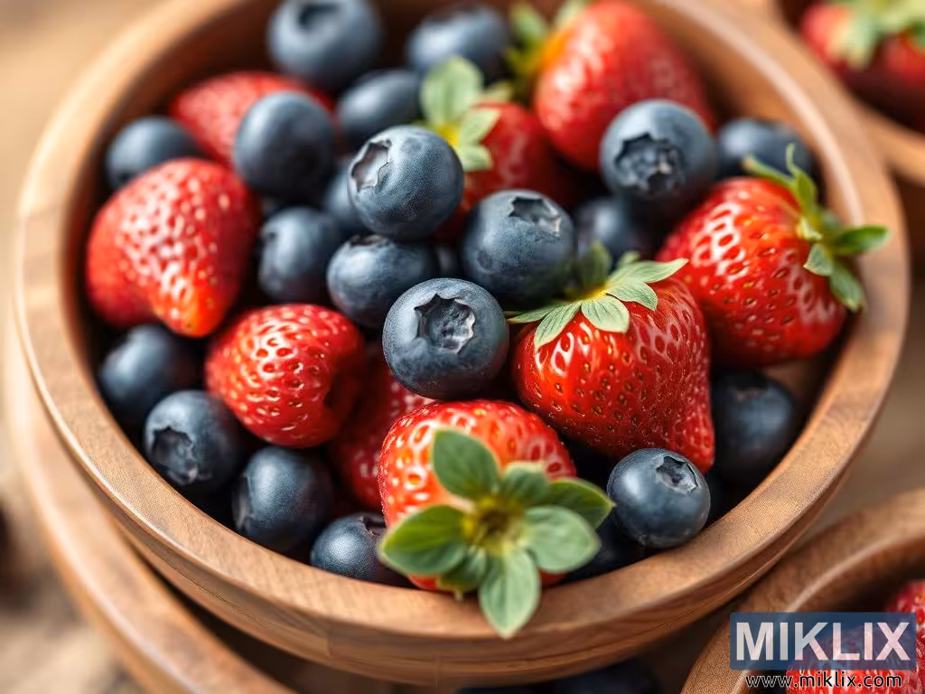 Maalaismainen puinen kulho sisältää kypsiä mansikoita ja mustikoita, jotka esittelevät eloisia värejä ja tuoreita, luonnollisia tekstuureja yksinkertaisessa ja viehättävässä asetelmassa.