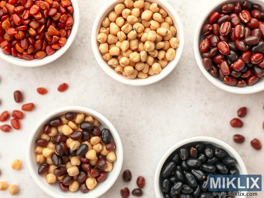 Viisi valkoista kulhoa, jotka on täytetty kikherneillä, punaisilla pavuilla, mustilla pavuilla ja sekoituksilla. Kulhot on aseteltu vaalealle pinnalle, ja niiden välissä on hajallaan papuja luomassa maalaismainen ja eloisa ilme.