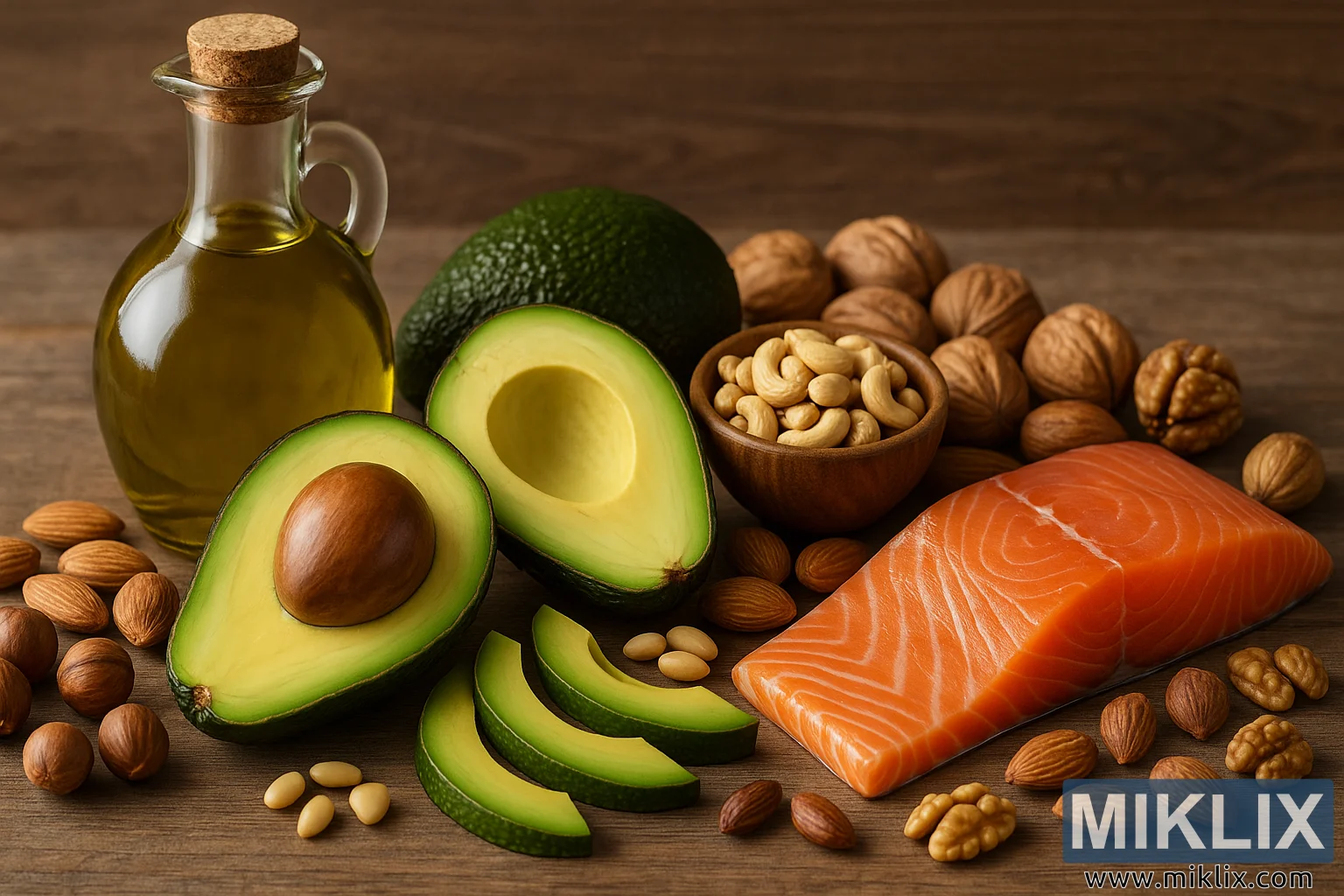 Lasipullo oliiviöljyä, avokadoa, pähkinöitä ja tuoretta lohifileetä aseteltuna maalaismaiselle puulle, esittelemässä eloisia, ravinteikkaita terveellisten rasvojen lähteitä.
