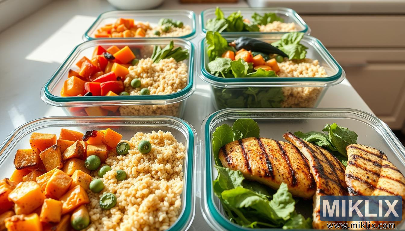 Siististi järjestetyissä lasiastioissa on paahdettuja vihanneksia, viljoja, vihreitä ja grillattua kanaa, jotka auringonvalo korostaa tuoretta ja eloisaa aterianvalmistusta varten.