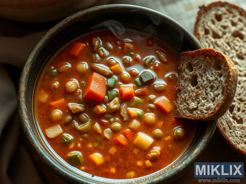 Kulho on kankaalla, ehkä pellavalla tai puuvillalla, peitetyllä alustalla, jonka hillityt sävyt korostavat ympäristön maalaismaista viehätystä. Valaistus on lämmin ja luonnollinen, ja se heittää pehmeitä varjoja ja hienovaraisia kohokohtia, jotka korostavat liemen kiiltoa, vihannesten eloisuutta ja leivän rakennetta. Se on maisema, joka tuntuu elävältä ja kutsuvalta, aivan kuin se olisi valmistettu viihtyisässä keittiössä viileänä iltapäivänä, valmiina nautittavaksi hitaasti ja tietoisesti.