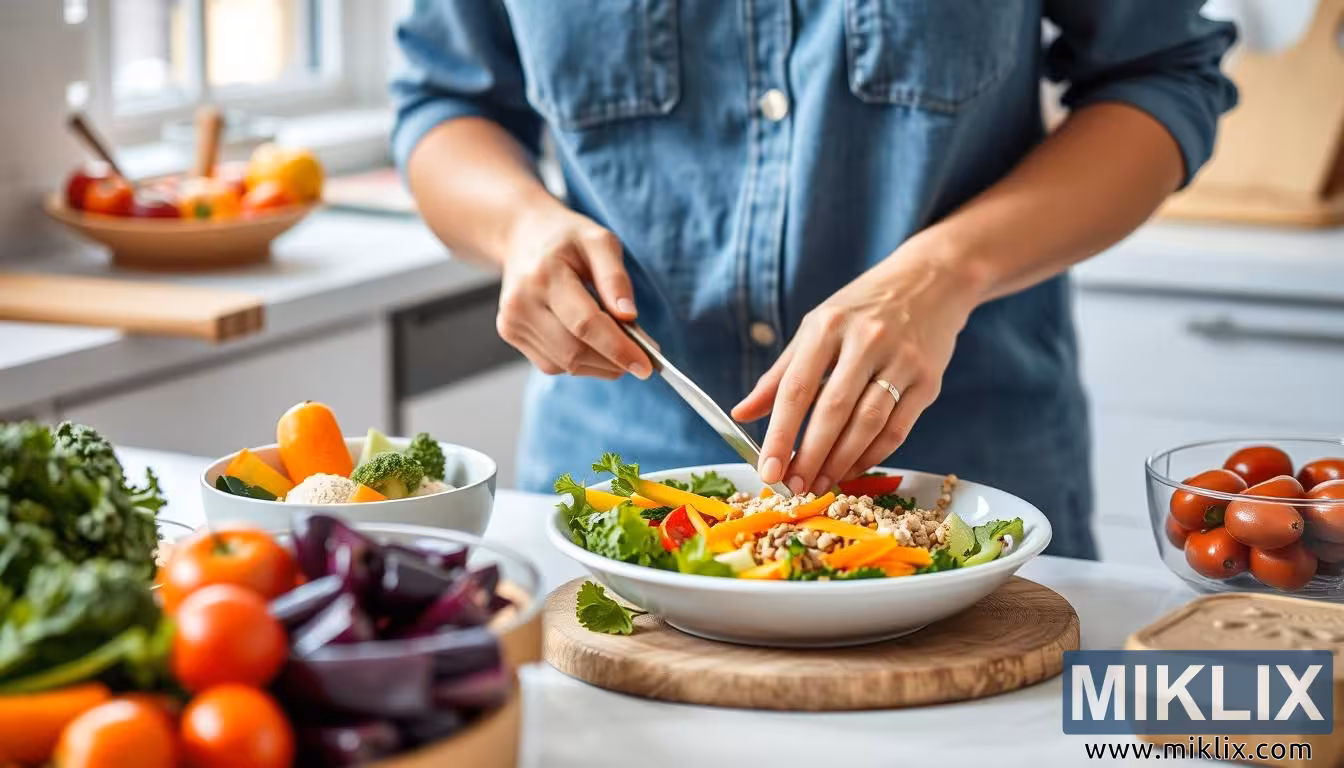 Aurinkoisessa, lämpöä ja selkeyttä huokuvassa keittiössä ihminen seisoo eloisan kulinaarisen hetken keskipisteenä valmistamassa tuoretta ja ravinnerikasta salaattia selvästi huolella ja tarkoituksella. Rentoon siniseen farkkupaitaan pukeutunut henkilö keskittyy viipaloimaan vihanneksia, kädet liikkuvat harjoitellun helposti suuren valkoisen kulhon yllä, joka on jo täynnä väriä ja tekstuuria. Kulho on kuin kangas täynnä terveellisiä aineksia – rapeita lehtivihanneksia pohjana, kerroksittain viipaloituja keltaisia paprikoita, jotka hohtavat kuin auringonsäteet, pulleita, kypsyneitä kirsikkatomaatteja ja ripaus jyviä, jotka lisäävät seokseen täyteläisyyttä ja täyteläisyyttä. Tuoreita yrttejä on ripoteltu kaikkialle, ja niiden herkät lehdet lisäävät tuoksuvan, vihreän aksentin, joka sitoo annoksen yhteen sekä visuaalisesti että aromaattisesti.