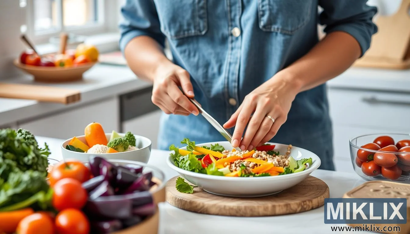 Henkilö viipaloi vihanneksia salaatiksi, joka sisältää vihreitä, paprikoita, tomaatteja, jyviä ja yrttejä, kirkkaassa keittiössä, joka on täynnä tuoreita tuotteita ja luonnonvaloa.