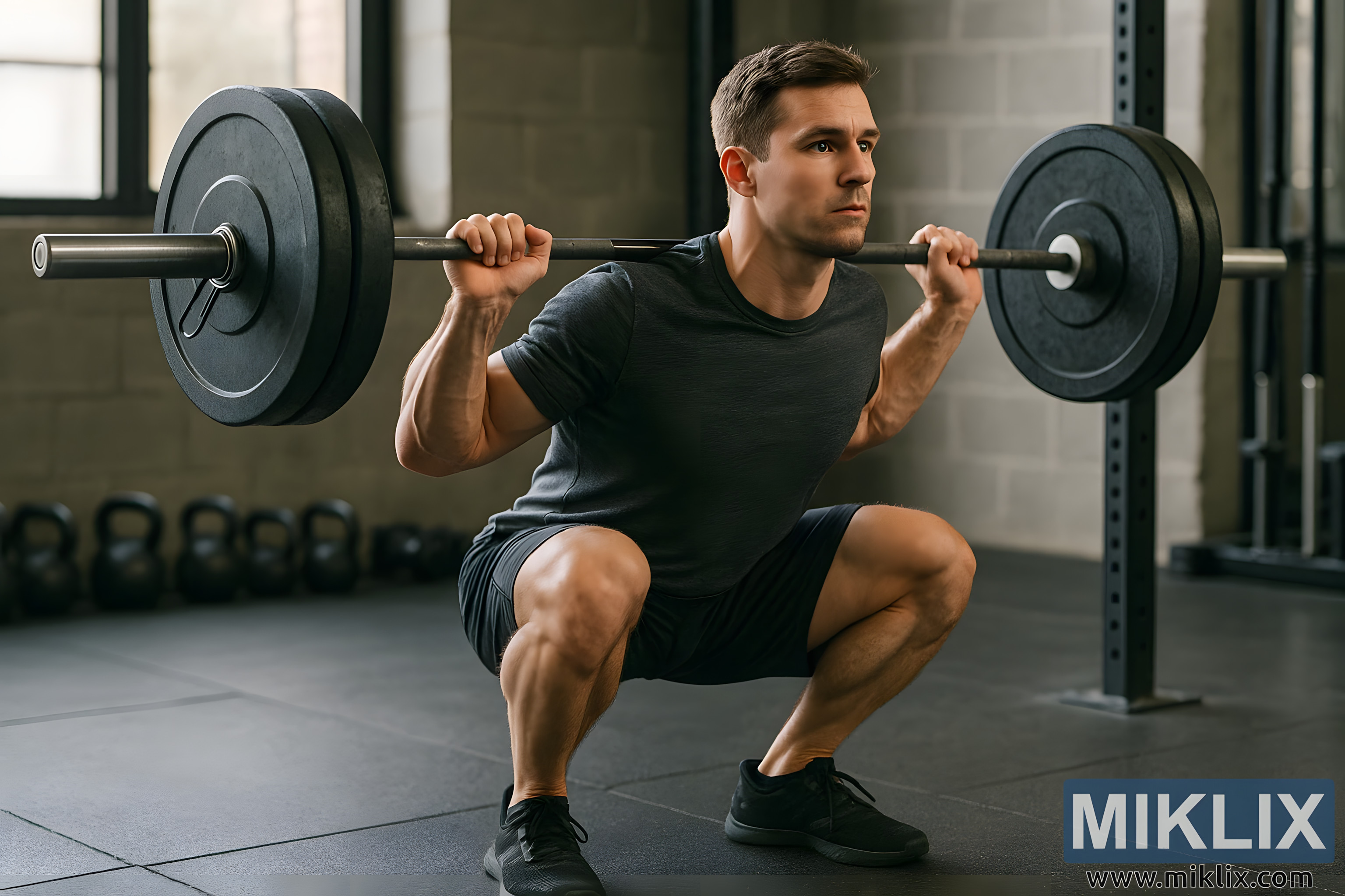 Ang isang matipunong lalaki sa isang modernong gym ay nagsasagawa ng barbell squat na may tamang anyo, na napapalibutan ng mga kettlebell at squat rack, na naiilawan ng malambot na natural na liwanag.