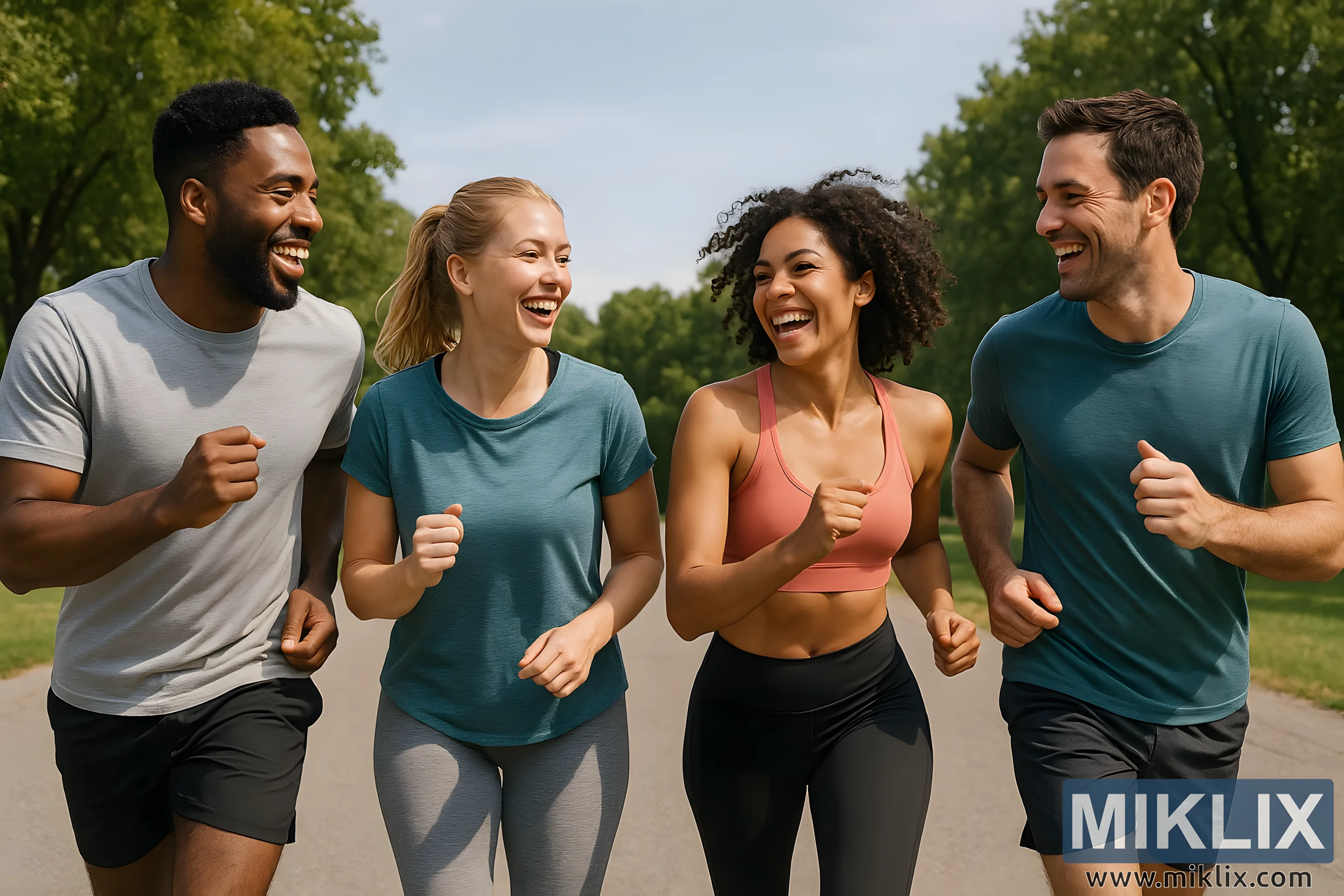Apat na magkakaibigan na nag-jogging magkasama sa isang maaraw na daanan ng parke na may linya ng mga puno, nakasuot ng makulay na damit na pang-sports at nakangiti, na nagbibigay ng fitness, saya, at pakikipagkaibigan sa labas.